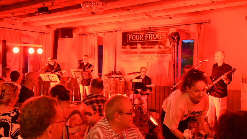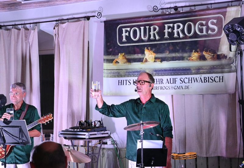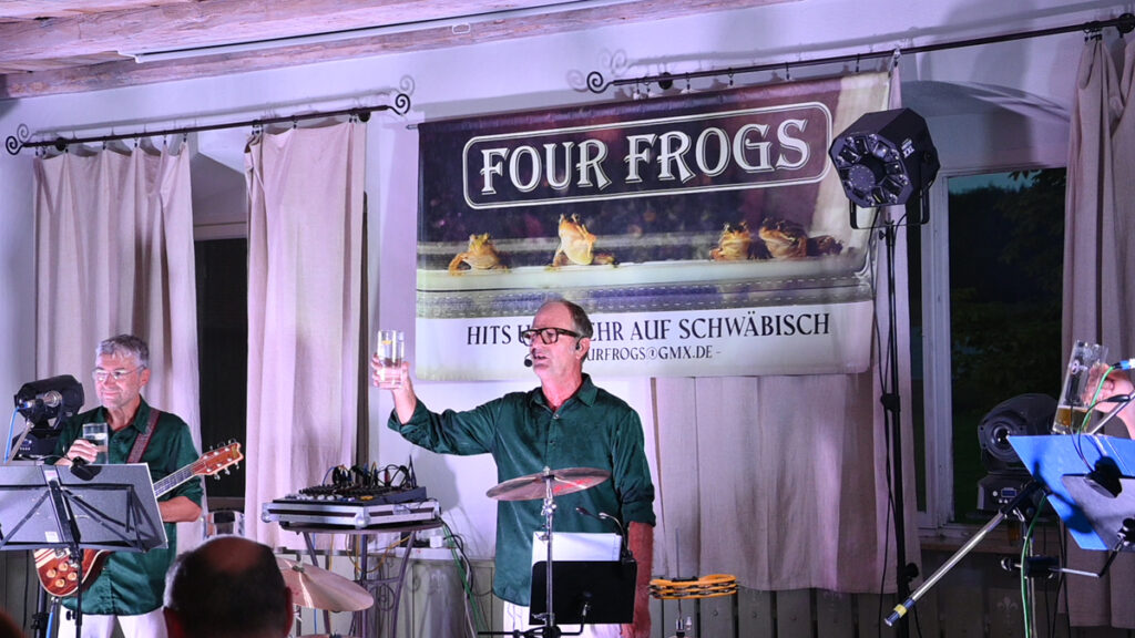 Wie die vier Frösche in ihrer Selbstdarstellung mitteilen, ist es das neue Konzept der Band: Ohrwürmer vergangener Tage, die jeder kennt, mit neuen, schwäbischen Texten zu versehen, die zum Schmunzeln und Mitsingen anregen sollen. Damit hatten sie an jenem August-Samstagabend (17.8.) auf jeden Fall den Geschmack ihres Publikums voll getroffen.