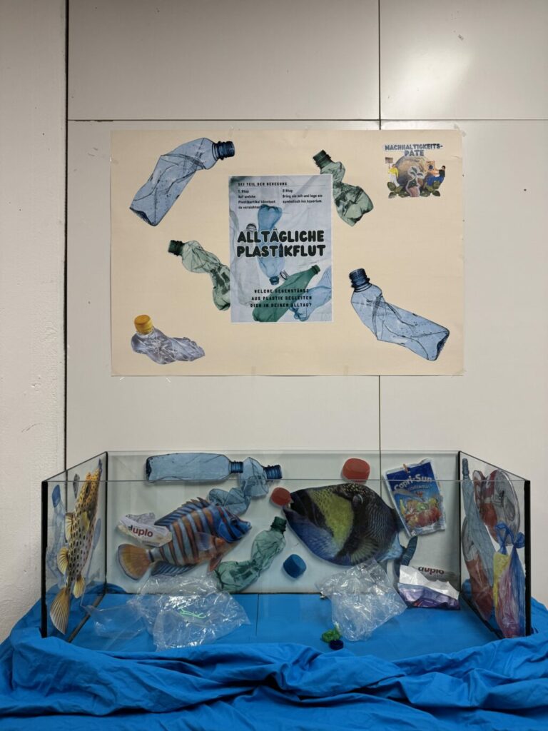 Die Treffen der Paten finden flexibel nach Bedarf und Aktion statt. Die erste Aktion bestand mit der Gestaltung eines Aquariums, das in einem der Vitrinen im Schulhaus ausgestellt wurde, um auf die unnötige Plastikflut in unserem Alltag aufmerksam zu machen und zum Nachdenken anzuregen. Wir sind gespannt auf weitere Aktionen.