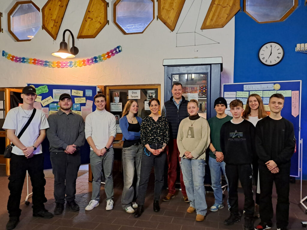 Im Jahr 2023 erhielt das ehrenamtliche Leitungsteam Fördermittel der Stiftung „Demokratie Leben!“. Dadurch bekamen sie die Möglichkeit, ihren eigenen Raum im Jugendhaus umzugestalten. Stolz stellten die Leitungsteammitglieder diesen nun ihrem Oberbürgermeister vor. Sowohl sie als auch Herr Henne nutzten diese Gelegenheit, um Fragen zu stellen.