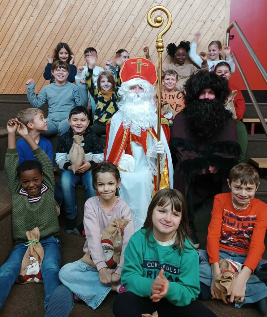 Die Klasse 4/5 nahm den Nikolaus und Knecht Ruprecht im Klassenzimmer in Empfang und trug ein Gedicht vor. Anschließend lauschten die Kinder aufmerksam der Ansprache des Nikolauses. Die Nikolaus-Feier der Klassen 1/2 und 3/4 fand im Foyer der Schule statt. Zum Auftakt sangen alle gemeinsam das Nikolaus-Lied.