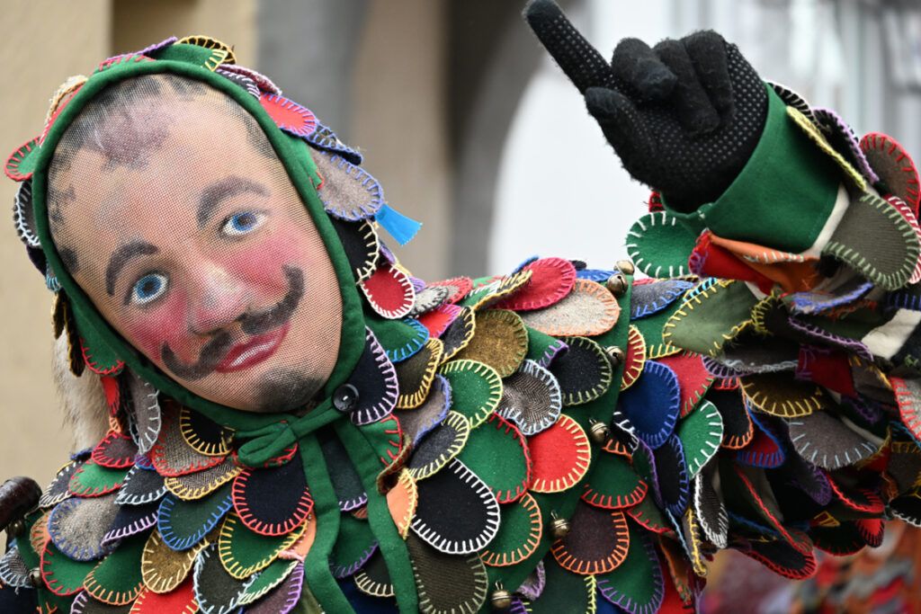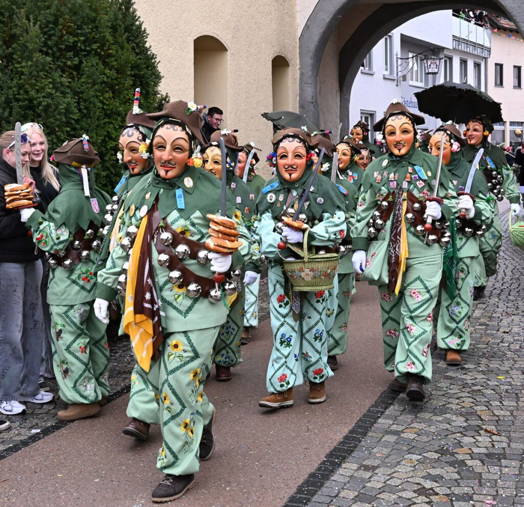 Mit dem Ruf „Do raus, det naus, bei d‘r alte Linda naus“ sprangen die Narren aus Bad Saulgau mit. Ob heute noch jemand den Schriftzug lesen kann? Sütterlin ist halt nicht mehr Lehrplan. Acht Maskentypen umfasst ihr Kosmos: Doraus-Schreier mit Wurstzipfel oder Fischschwanz, Riedhutzel, Zennenmacher, Pelzteufel, Blumennärrle, Spitzmäule, Büttel sowie Adam und Nachtwächter – närrische Vielfalt mit Traditionsgarantie.