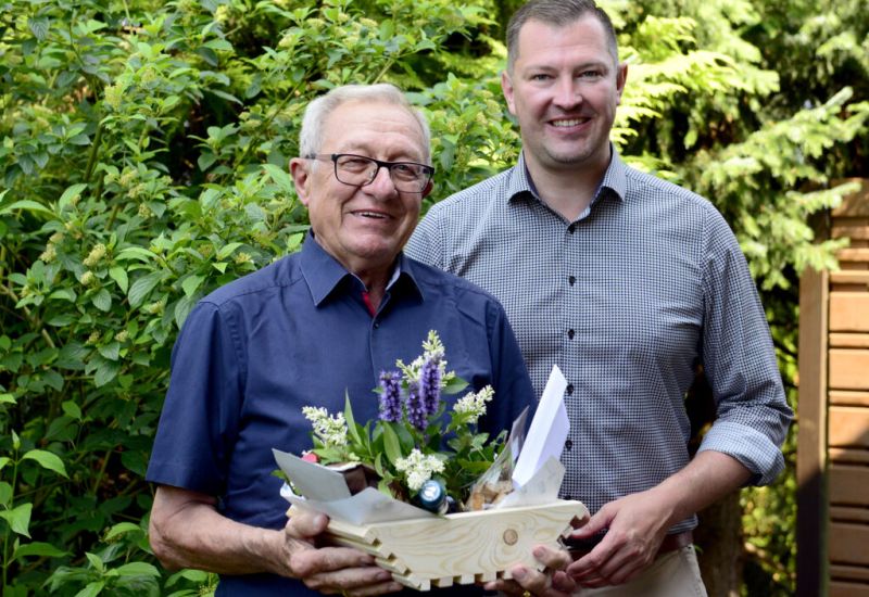Oberbürgermeister Matthias Henne besuchte den Jubilar an seinem Ehrentag und überbrachte die herzlichsten Glückwünsche sowie einen Geschenkkorb: „Alles erdenklich Gute und bleiben Sie gesund und weiter so fit“.