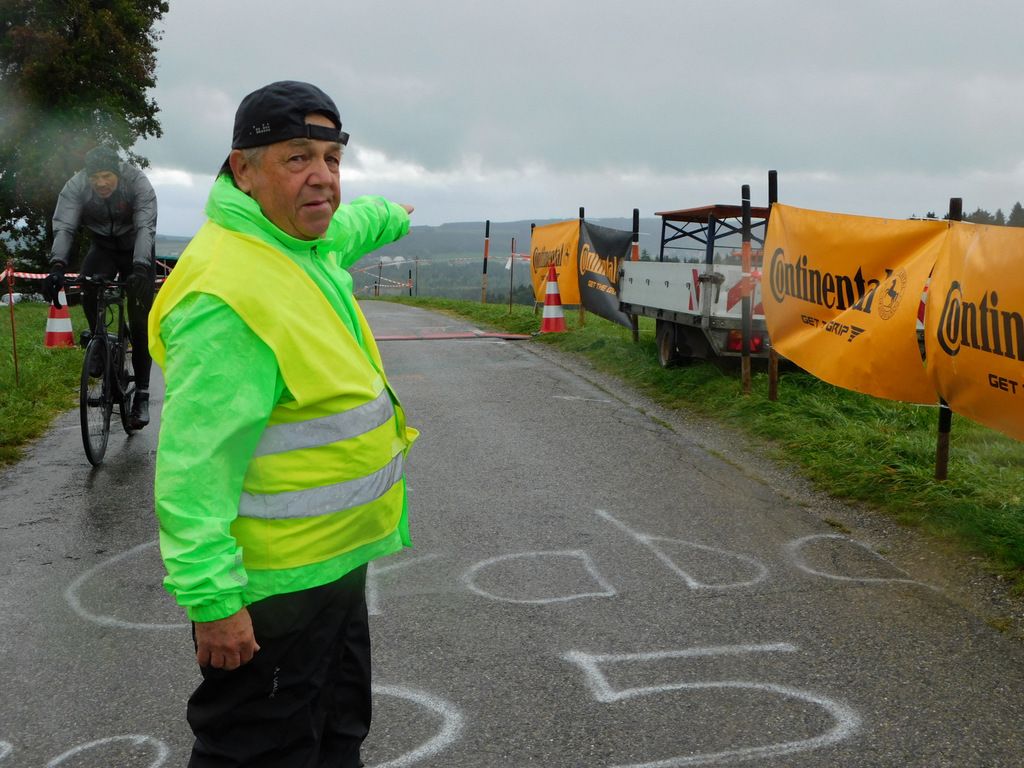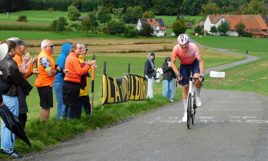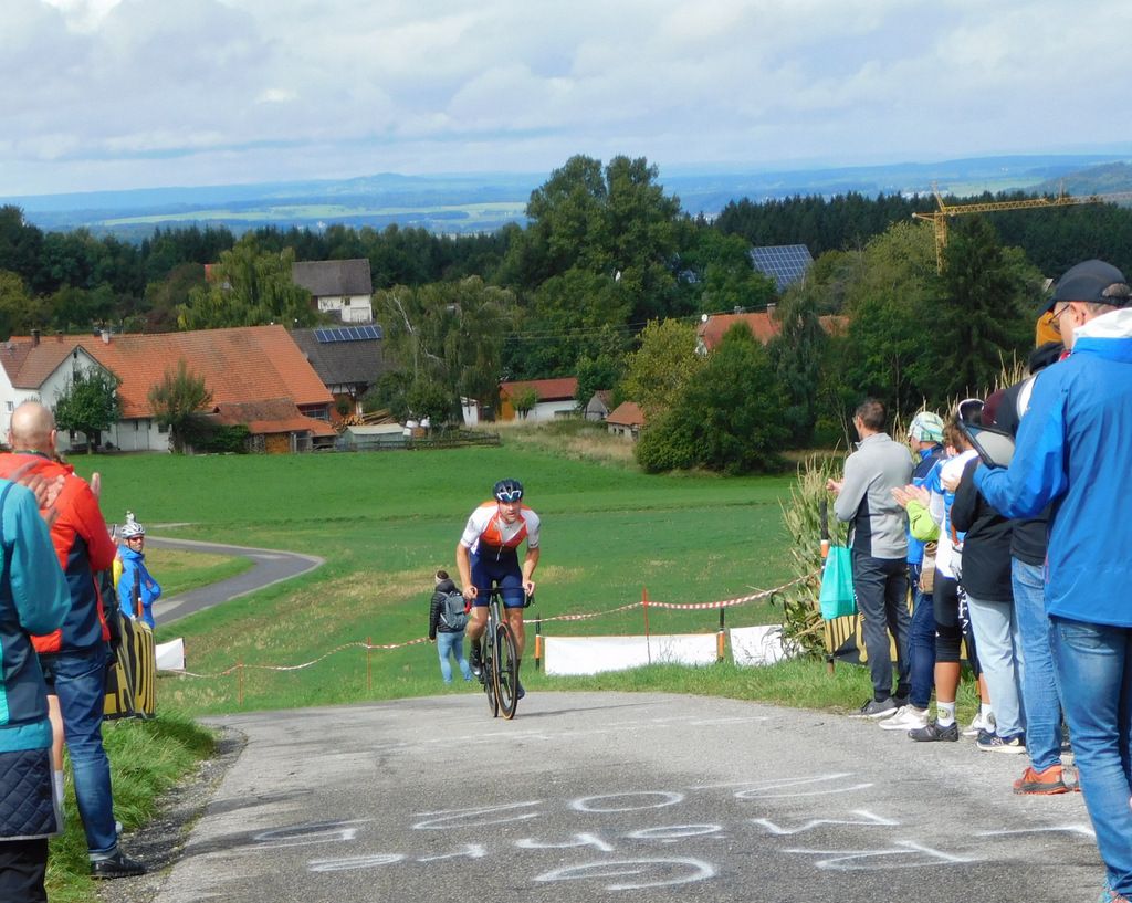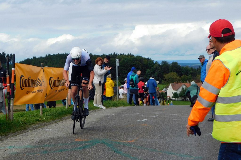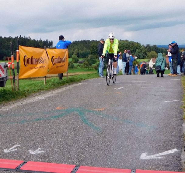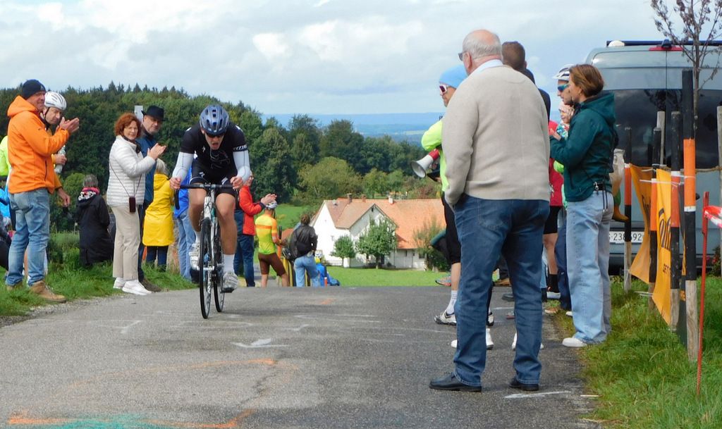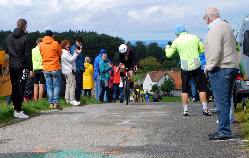 Oben auf der Grabener Höhe beim Ziel hatten sich erfreulich viele Zuschauer eingefunden. Als dann der erste Teilnehmer am Einzelzeitfahren die letzte Anhöhe zum Ziel hinaufkeuchte und oben eintraf, drangen die ersten Sonnenstrahlen durch die Wolkendecke und es wurde danach richtig sonnig.