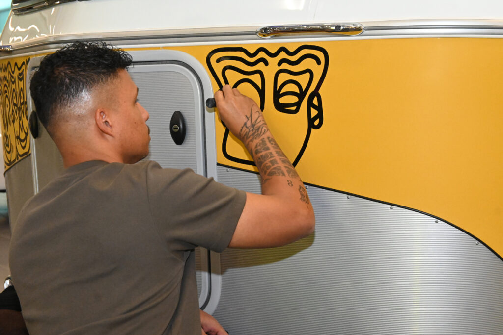 Vor den Augen begeisterter Zuschauer verwandelte Kuranij den Klassiker unter den Wohnwagen in ein einzigartiges Kunstwerk. Mit einem einfachen, dicken, schwarzen Stift und seinem unverwechselbare Stil brachte er die typischen „Kuranij-Gesichter“ auf die gelb lackierte Außenhaut des Tourings.