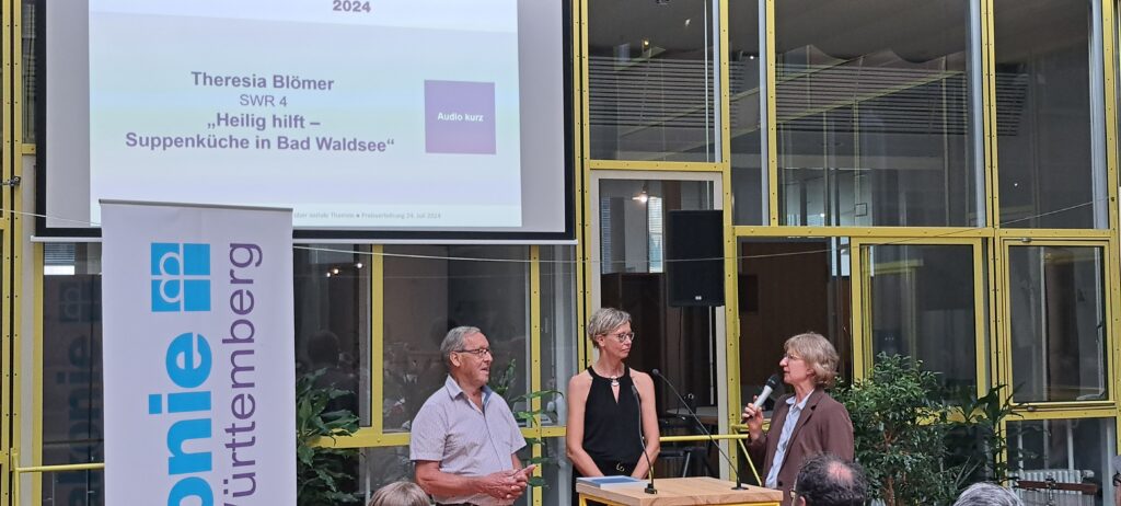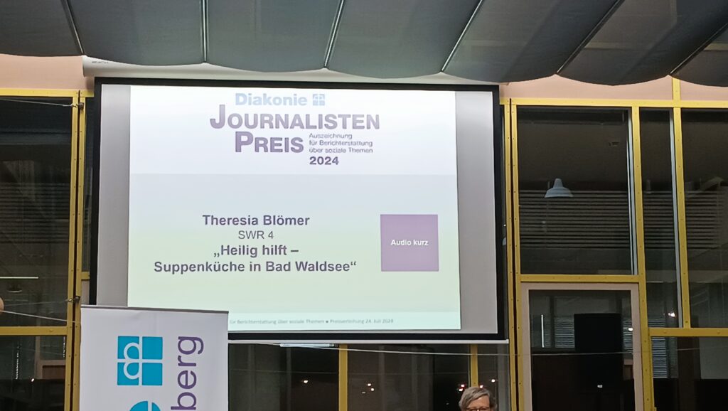 Bad Waldsee – Den Preis für die Kategorie Audio (Kurzbeitrag) bekam Theresia Blömer für die Radio-Reportage „Heilig hilft – Suppenküche in Bad Waldsee“, die auf SWR 4 lief. Der Beitrag gibt Einblick in den Alltag des Mittagstisches, den Rudi Heilig organisiert.
