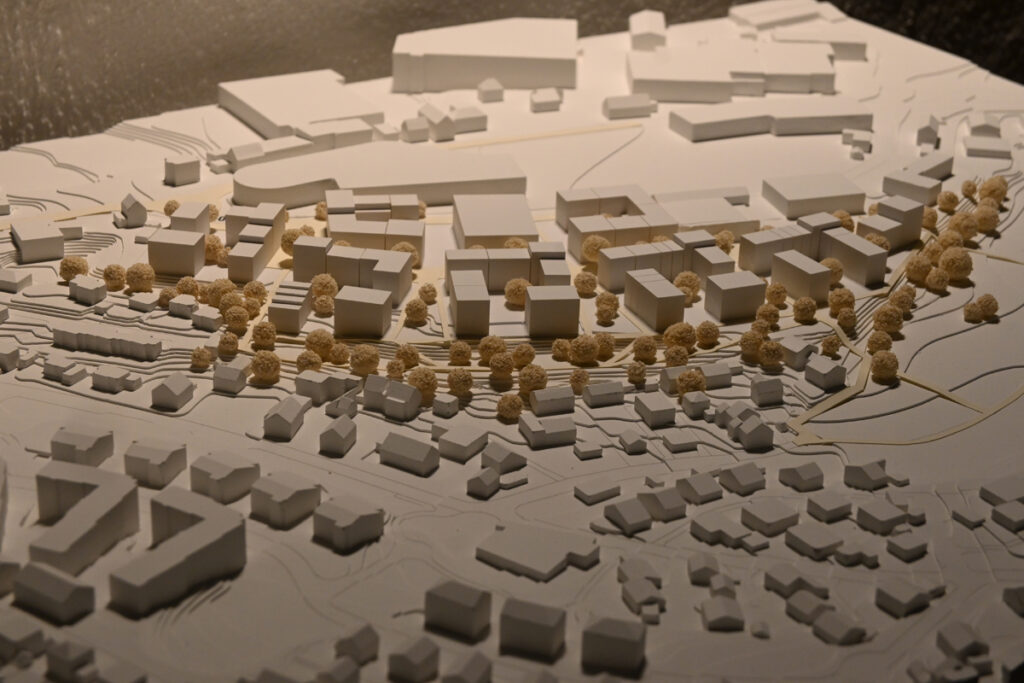 Das Herausragende an dieser Planung ist der breite Grüngürtel, der das neue Bauquartier von der vorhandenen Bebauung am Rädlesbachweg trennt. Um auf der Fläche die Anzahl an Wohnungen unterzubringen, sind für Bad Waldsee relativ große Baukörper mit drei bis sechs Geschossen geplant. Das Modell macht den Größenunterschied zwischen vorhandener Ein- und Zweifamilienhausbebauung am Rädlesbachweg und den Bauten des neuen Quartiers deutlich. Da das neue Quartier auch deutlich höher liegt als die bestehenden Bauten am Rädlesbach, hilft der Grüngürtel, eine optische Bedrückung abzumildern.