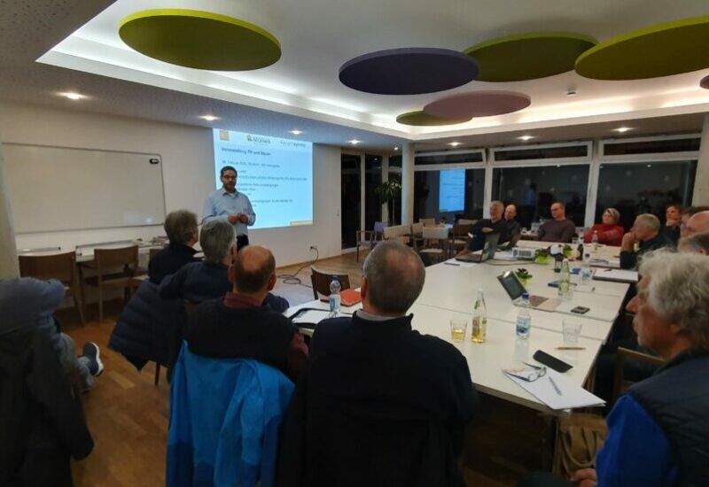 Das Treffen fand in Grünkraut statt, im Zentrum des Landkreises Ravensburg, in dem die PV-Scouts verteilt sind. Insgesamt nahmen 25 PV-Scouts teil und vier Gäste – neue PV-Scouts aus dem Bodenseekreis – waren ebenfalls anwesend. Inhalt des Stammtischs war ein Update zu Gesetzen und Regelungen im PV-Bereich durch Herrn Michael Maucher von der Energieagentur Ravensburg. Des Weiteren diskutierten die Anwesenden unter anderem über PV-Angebotsbeurteilung und Wirtschaftlichkeitsberechnung sowie allgemein über die Pläne und Ziele zur Klimaneutralität.