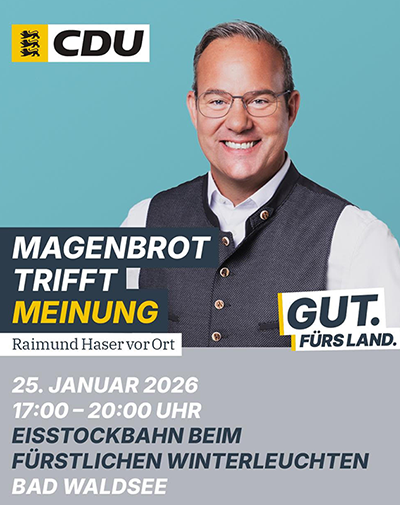 Unter dem Motto „Magenbrot trifft Meinung“ bietet sich die Gelegenheit, bei einem süßen Imbiss mit Raimund Haser ins Gespräch zu kommen und aktuelle politische Themen direkt vor Ort zu diskutieren. Die CDU Bad Waldsee freut sich auf zahlreiche Besucherinnen und Besucher.