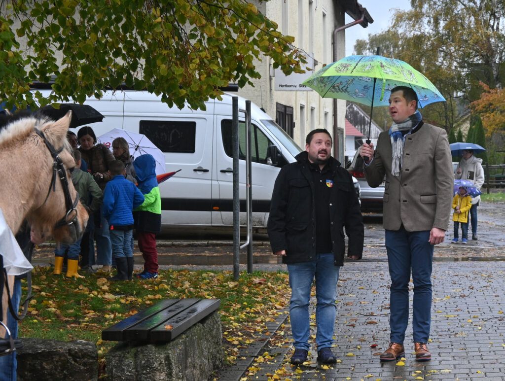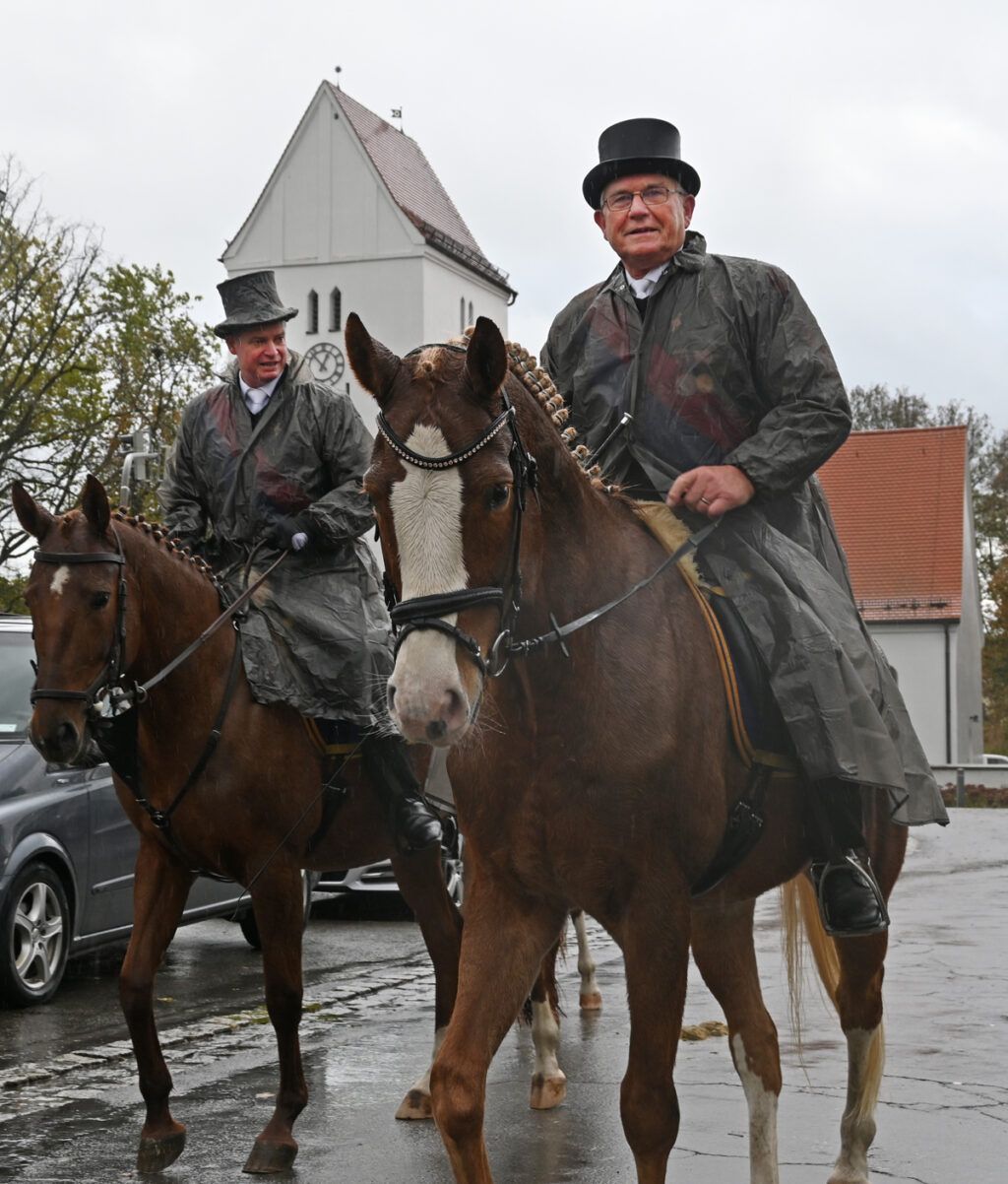Nach einem Festgottesdienst im Dorfgemeinschaftshaus begrüßte OB Matthias Henne, unter einem Bad Waldsee-Schirm wohl behütet, Reiter und Gäste. Diakon Franz Fluhr segnete mit Gebet und sprengte hoch vom Ross Weihwasser über Ross und Reiter, bevor sich die Pferdeprozession formierte.
