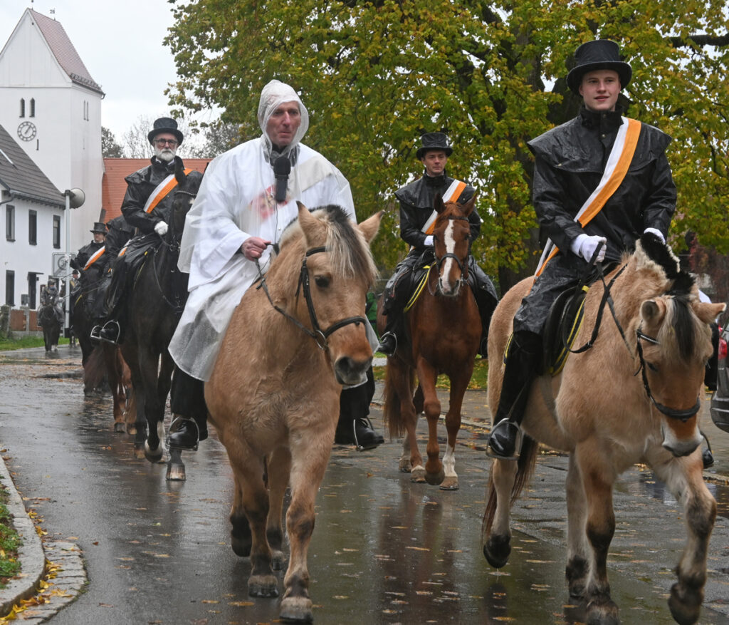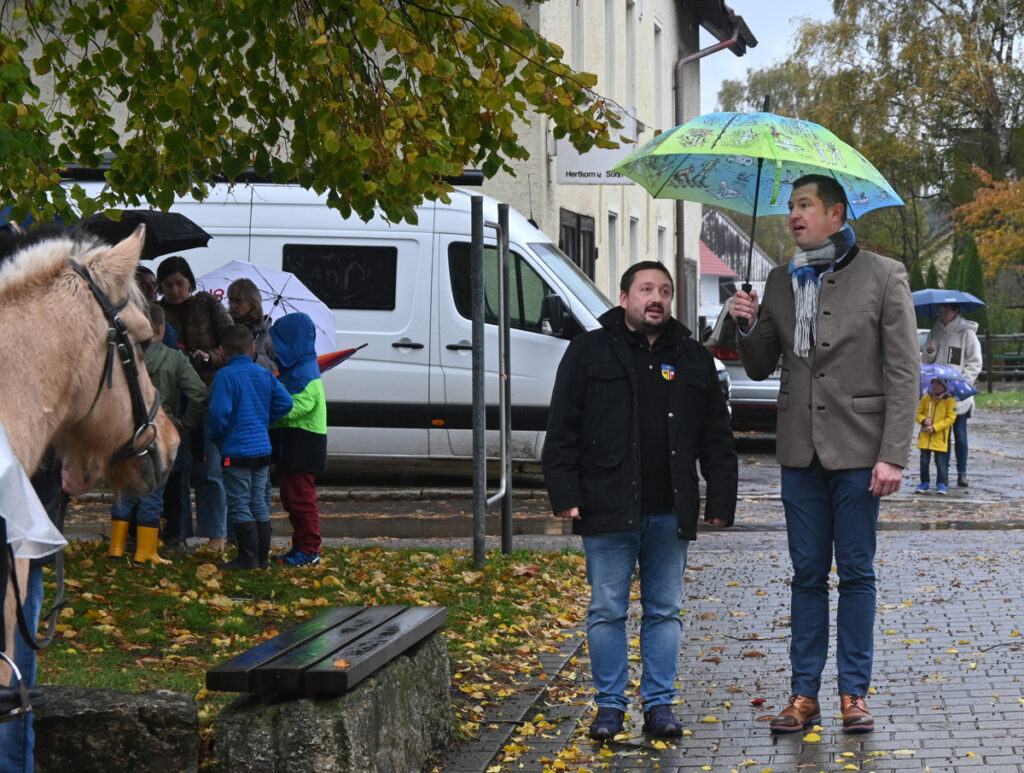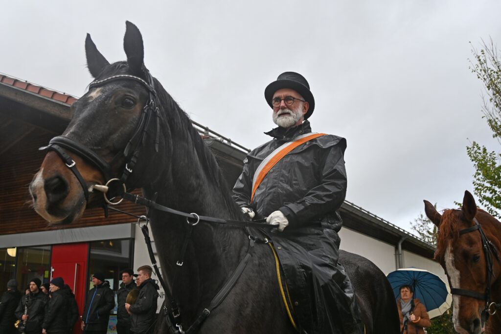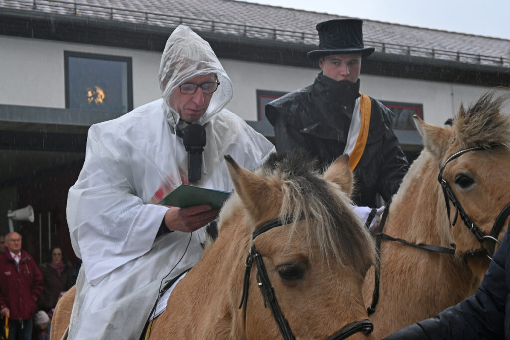 Nach einem Festgottesdienst im Dorfgemeinschaftshaus begrüßte OB Matthias Henne, unter einem Bad Waldsee-Schirm wohl behütet, Reiter und Gäste. Diakon Franz Fluhr segnete mit Gebet und sprengte hoch vom Ross Weihwasser über Ross und Reiter, bevor sich die Pferdeprozession formierte.