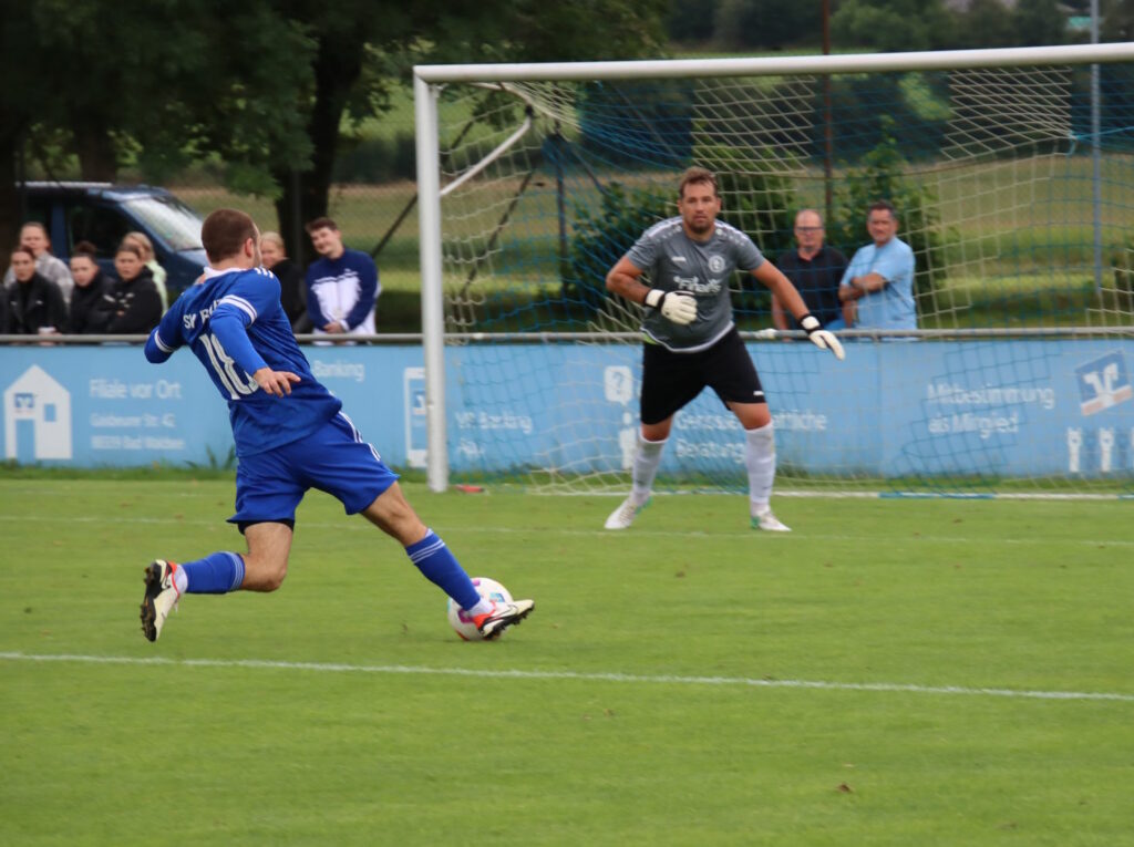 Mit viel Motivation kam Reute aus der Halbzeitpause zurück und hatte schnell durch Marian Mrotzek die große Chance zum Ausgleich, doch erneut verhinderte Aluminium einen Reutener Treffer. Während die Gäste in der Folge auf die Entscheidung drückten, rannte der SVR mit viel Aufwand dem Rückstand hinterher. Gut zwanzig Minuten vor Spielende gab’s Strafstoß für Bad Waldsee, doch SVR-Keeper Eldin Sekic konnte bravourös parieren. Das gab dem Team um Timo Leuter und Robin Reuter weiteren Auftrieb, doch bei einem Kopfball von Johannes Freßle war zum vierten Mal an diesem Tag das Gestänge der FVW-Kiste im Weg. Reute warf in den letzten Minuten alles nach vorne und hatte durch Niklas Maucher und Marvin Nowak zwei weitere dicke Möglichkeiten zum längst verdienten Ausgleich. Doch es sollte nicht sein, am Ende unterlag Reute ziemlich unglücklich im Derby gegen die Waldseer Zweite.