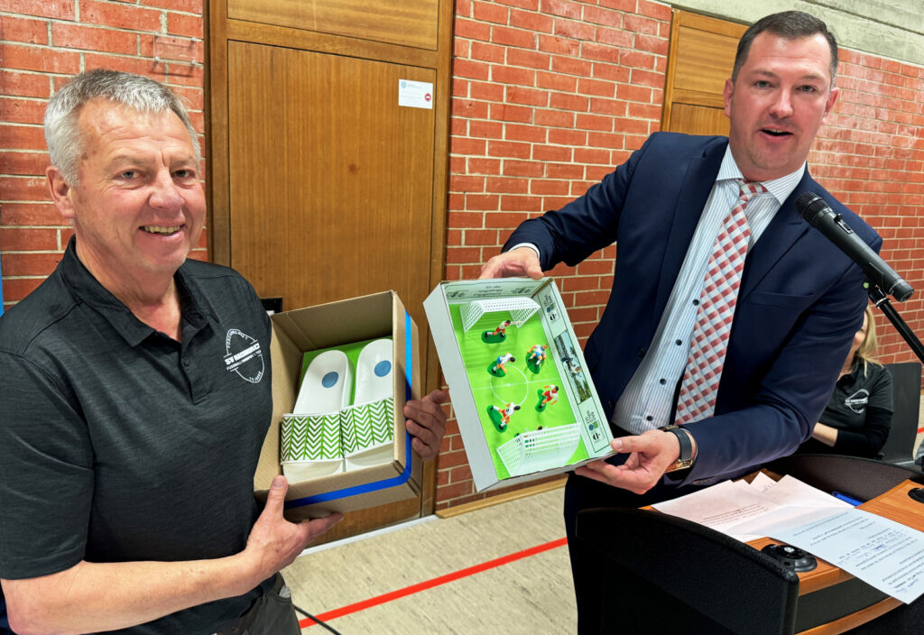 Sinnige Präsente gab es für Roland Braig, überreicht vom Oberbürgermeister. Dazu gehörte ein Paar Pantoffeln für die Ruhephase und symbolisch ein Mini-Kunstrasenfeld, für das in natura sich Roland Braig im Sinne der vier Bad Waldseer Fußballvereine stets stark gemacht hat. Die engsten Mitstreiter übergaben ein mit vielen Unterschriften signiertes Erinnerungsbild und einen großen Geschenkkorb. Bettina Stauder-Bitterwolf freute sich über einen riesigen Blumenstrauß, der ihr zum Abschied aus dem Ehrenamt als Abteilungsleiterin übergeben wurde. Ein Präsent gab es auch für Andreas Staiger, der drei Jahre lang als Fußballabteilungsleiter fungierte.