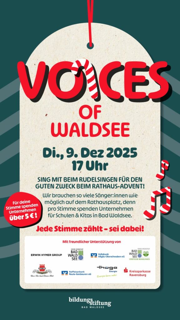 Bad Waldsee – Am Dienstag, 9. Dezember, lädt die Bildungsstiftung Bad Waldsee erstmals zu „Voices of Waldsee“ im Rahmen des Waldseer Rathausadvents ein. Während an den anderen Abenden beim Öffnen des Türchens eine musikalische Unterhaltung geboten ist, dürfen an unserem Abend alle Stimmen aus Bad Waldsee selber mitmachen. Die „Voices of Waldsee“ werden von der erfahrenen Chorleiterin Geli Zimmermann dirigiert, am Klavier begleitet Carl-Martin Holweger und es werden kostenlose Texthefte verteilt, damit auch wirklich jeder mitsingen kann.