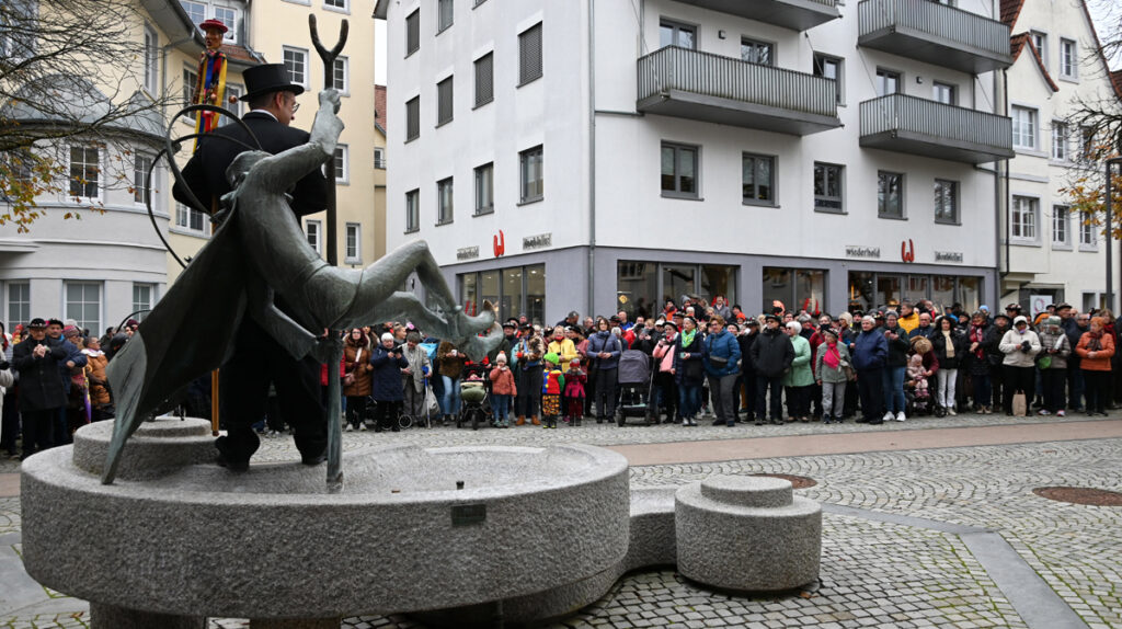 Geschätzt zwei-, dreihundert Zuschauer, darunter auch Altbürgermeister Rudolf Forcher, hatten sich bei trübem, kaltem, aber trockenem Novemberwetter auf der Bad Waldseer Hochstatt am Federlesbrunnen versammelt. Kurz vor elf Uhr kam forschen Schrittes, in der einen Hand seinen überdimensionalen Wecker, in der anderen seinen Narrenstab, mit schwarzem Gehrock und Zylinder, ein Blumensträußchen am Revers, Fasnetslader Ralph Zell anmarschiert, enterte den Brunnen, nahm das Mikro und brachte die Zuschauer mit seinem flotten Mundwerk auf Touren.