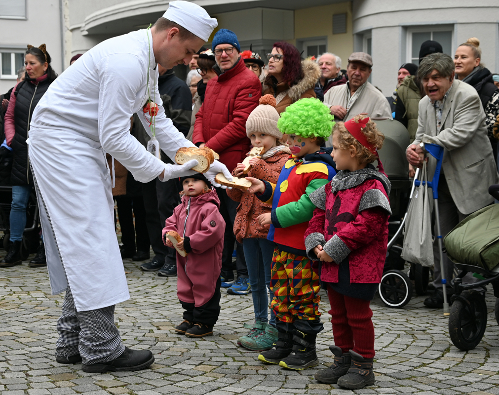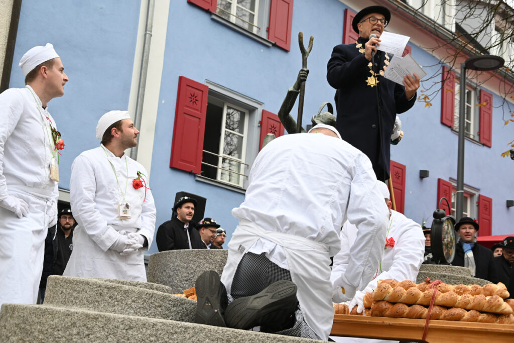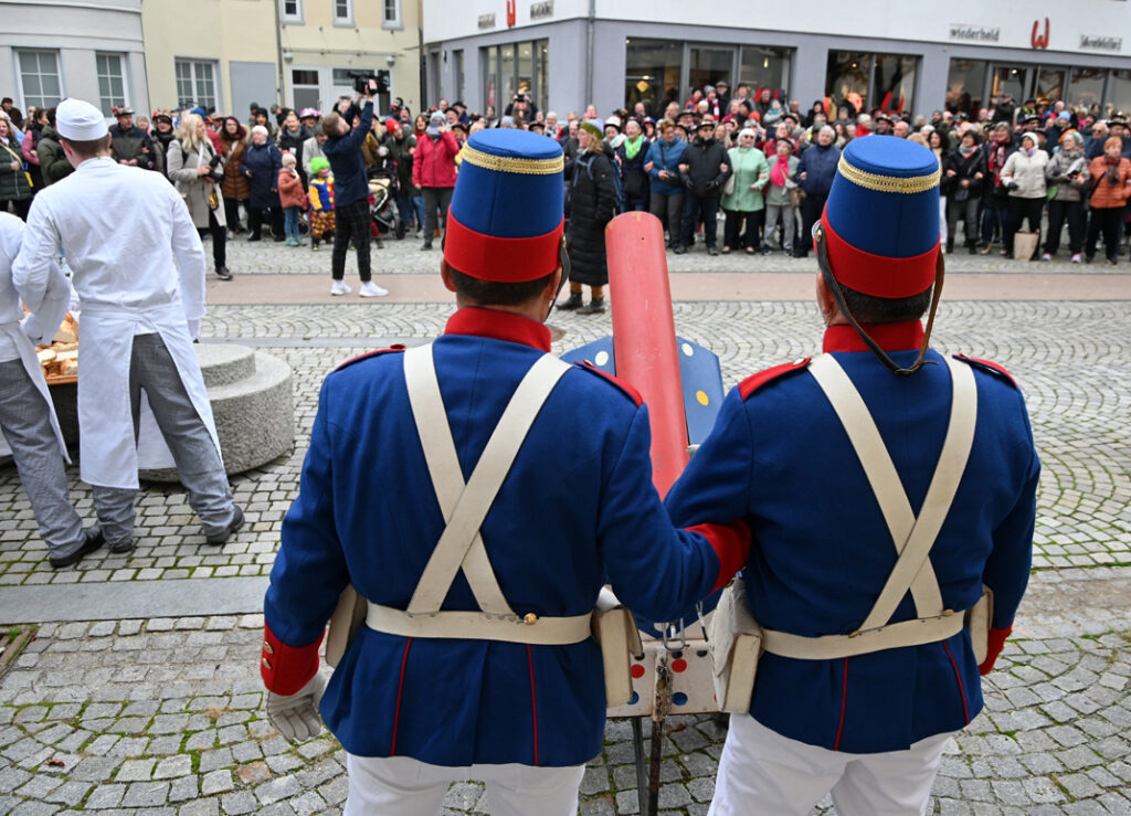 Gemeinsam mit den Zuschauern wurden die letzten Sekunden heruntergezählt: zehn, neun, acht, sieben, sechs, fünf, vier, drei, zwei, eins. Pünktlich um 11 Uhr 11 am Elften Elften rasselte der Wecker, schossen die Kanoniere der Narrenzunft den ersten Böller aus der Konfetti-Kanone. Vom „Hasen“ her erklang die Sammlermusik, der Zunftrat, die Stadtspitze und die Bäckerburschen mit ihrem großen Fasnetszopf hielten Einzug.