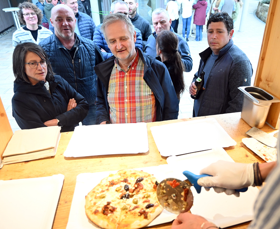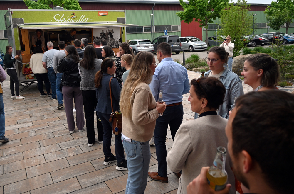Eine gut gelaunte Menschenschlange reiht sich vor einem Imbisswagen ein. Fleißige Hände backen dort knusprige Bio-Pizzen im Akkord. Vegan, mit Schinken und Salami, mit und ohne scharfe Pepperoncini – was das Herz begehrt. An vielen runden Tischen werden die Pizzen mit Appetit verzehrt, zwei große Kühlschränke halten Getränke mit und ohne Alkohol bereit. Die Atmosphäre ist locker, die Unterhaltung fröhlich. Es macht einfach gute Laune, nach einem langen Tag mit vielen Präsentationen den Tag mit einem Fest ausklingen zu lassen.