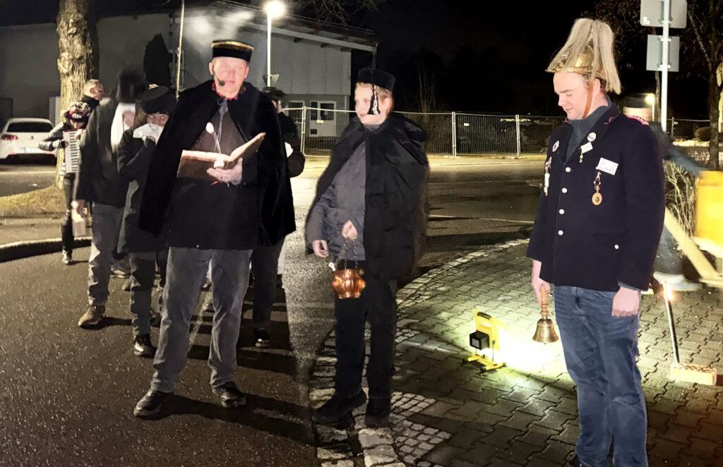 Königstal – Bei winterlichem Schmuddelwetter wurde am Abend des Fasnetsdienstags das Ende der Fasnetssaison 2026 im Königstal öffentlich verkündet mit bekanntem Zeremoniell. Das geschah wiederum im Freien auf dem Vorplatz des Dorfgemeinschaftshauses. Bedingt durch das unwirtliche Wetter hatten sich weniger Zuschauer als gewohnt eingefunden. Über dem Urbachtal waren dunkle Regenwolken aufgezogen, als die treuesten, aktiven Närrinnen und Narren im Fackelzug zum Schauplatz vor dem Gemeindehaus marschierten.