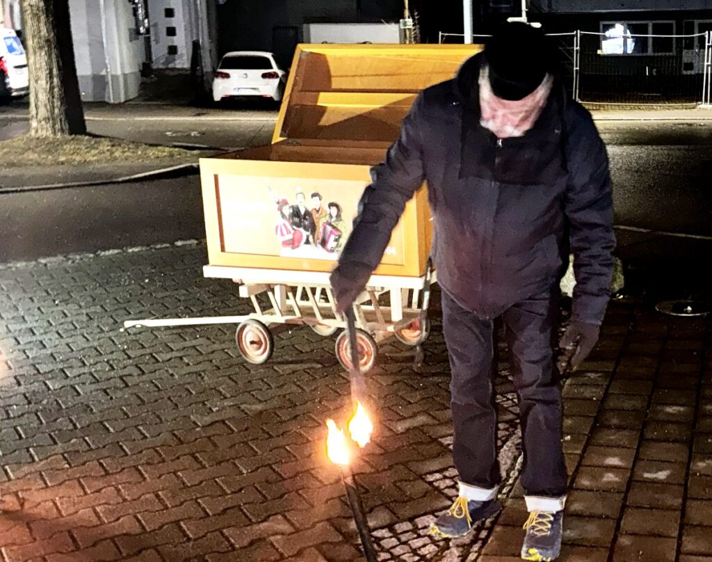 Aus dem Dunkel der Nacht kam der Trauerzug. Eine Abordnung der Sammlerkapelle spielte den Trauermarsch, der von den lauten „Oh jerum, oh jerum“-Rufen sogar übertönt wurde. Ganz hinten wurde auf einem Leiterwagen die noch leere Königstäler Fasnets-Truhe mitgeführt. Chauffeur war Gere Frick, Ehrenpräsident der Königstäler Narren, der jahrzehntleang als Fasnetslenker im Einsatz war und immer noch voll dabei ist. Das Trauerszenario wurde mit Lichteffekten geschickt beleuchtet.