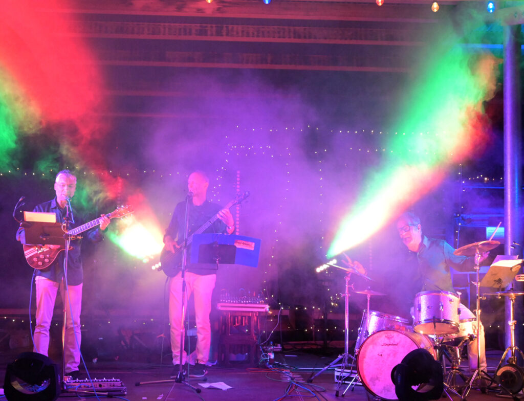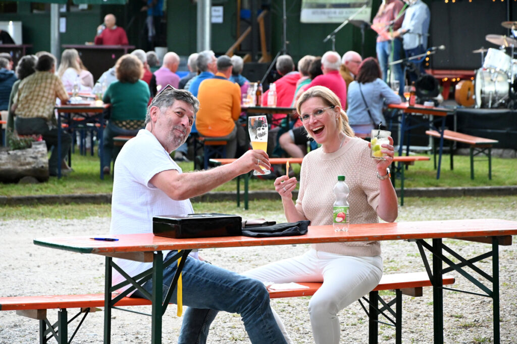 Auf den Bänken vor der Bühne hatte sich eine ansehnliche Menge versammelt. Grob geschätzt mehr als hundert, aber weniger als zweihundert. Ortsvorsteher Achim Strobel glänzte als Grillmeister, brutzelte Rote und Steaks, servierte Kartoffelsalat und Pommes Frites. Für Essen und Trinken war bestens gesorgt und perfekt organisiert. Eine Station zum Bezahlen, eine für Getränke und einen Imbissstand, eine Rückgabe fürs gebrauchte Geschirr. Die Begrüßung an der Kasse hatten zwei bekannte Spektrum-K-Organisatoren übernommen: Marion und Roland Metzler.