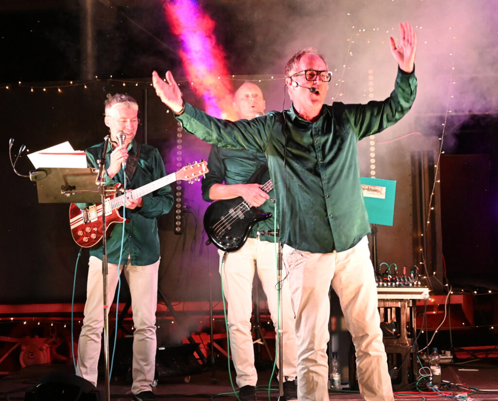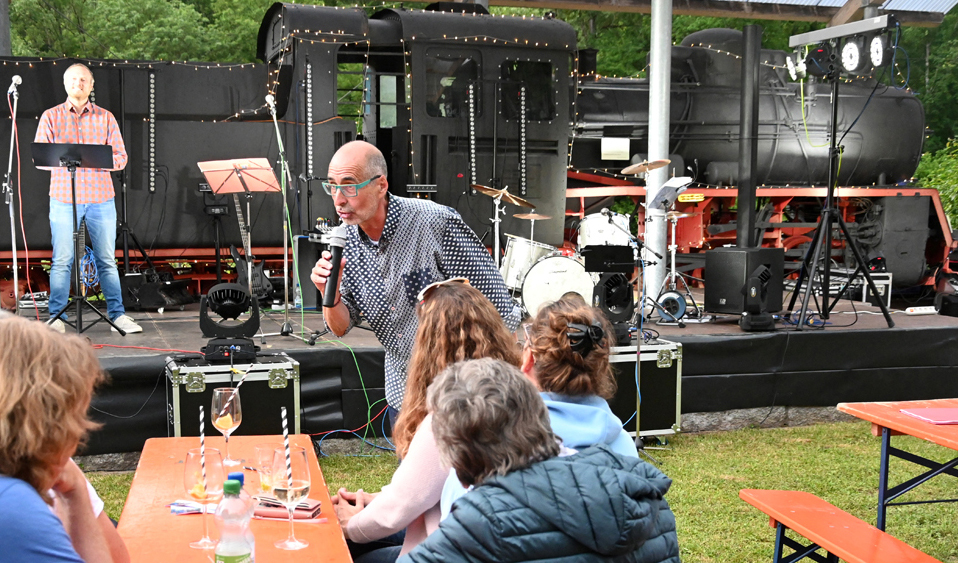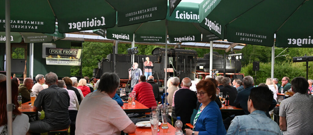 Bad Waldsee – Zusammen mit Spektrum K brachte der Bähnlesverein am Samstagabend (31.5.) „Let’s schwätz schwäbisch“ auf die Bühne am Durlesbacher Eisenbahndenkmal. Mit Barny Bitterwolf und Wolfgang Heyer waren zwei herausragende Vertreter der schwäbischen Mundart am Werk und mit den „Four Frogs“ eine neu formierte Band „alter Hasen“, die bekannten Ohrwürmern aus den sechziger bis achziger Jahren mit schwäbischen Texten ein neues Leben einhauchen.