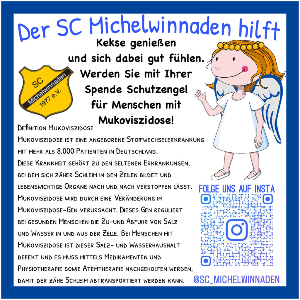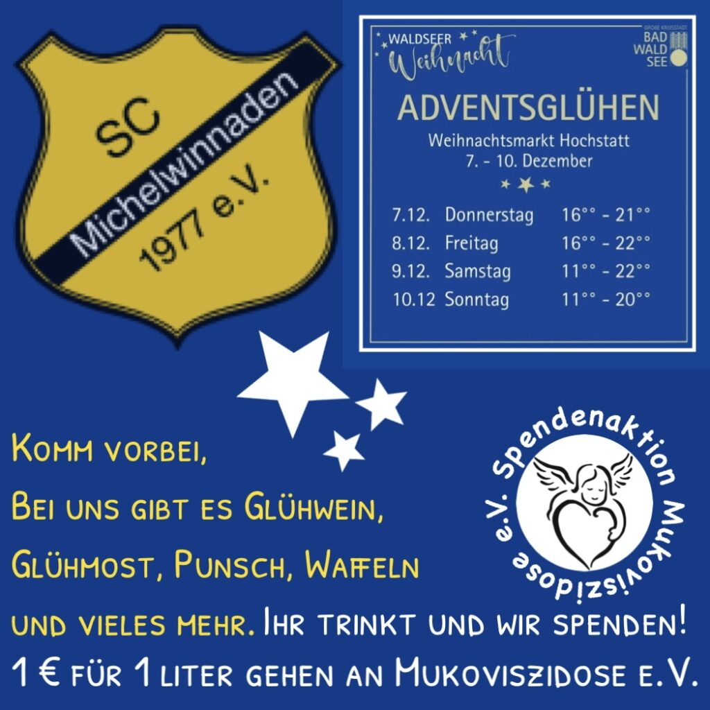 Wie im vergangenen Jahr ist der SC Michelwinnanden auch wieder beim „Waldseer Adventsglühen“, dem Weihnachtsmarkt auf der Hochstatt vom 7. bis 10 Dezember mit dabei und unterstützt den Mukoviszidose e.V. mit einer kleinen Spendenaktion. Verkauft werden Glühwein, Glühmost, Punsch, Waffeln und Plätzchen.