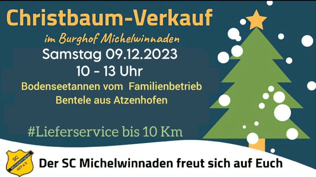 Michelwinnaden – Bereits das fünfte Jahr in Folge veranstaltet der SC Michelwinnaden einen Christbaumverkauf; heuer am 9. Dezember von 10.00 bis 13.00 Uhr. Verkauft werden im Burghof in Michelwinnaden wunderschöne Nordmanntannen in verschiedenen Größen vom Familienbetrieb Bentele aus Atzenhofen. Auf Wunsch wird Ihnen Ihr Christbaum von den Fußballern des SCM kostenfrei bis an Ihre Haustür geliefert (Umkreis 10 Kilometer).