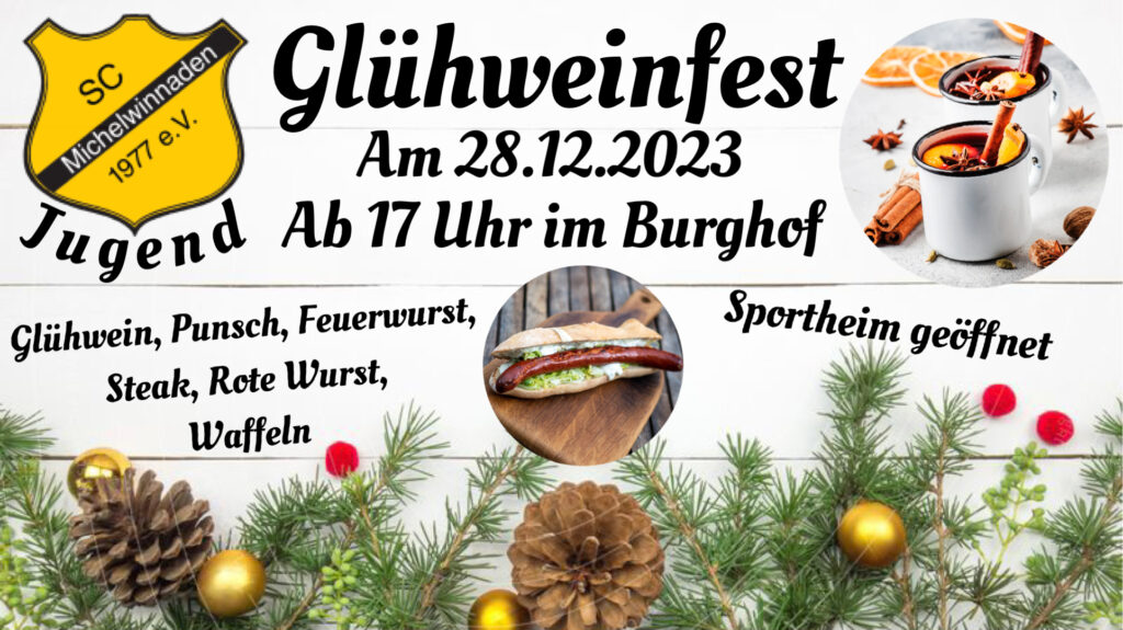 Weiter geht es dann traditionell vor dem Jahreswechsel mit dem Glühweinfest des SC Michelwinnaden. Die Jugendabteilung des SC Michelwinnaden lädt am Donnerstag, 28. Dezember ab 17.00 Uhr in den Burghof zu Glühwein, Punsch, Glühmost, Apfelküchle, Waffeln und Steak ein. Natürlich darf die allseits beliebte Feuerwurst auch nicht fehlen. Der Erlös kommt der Jugend des SC Michelwinnaden zu Gute.“