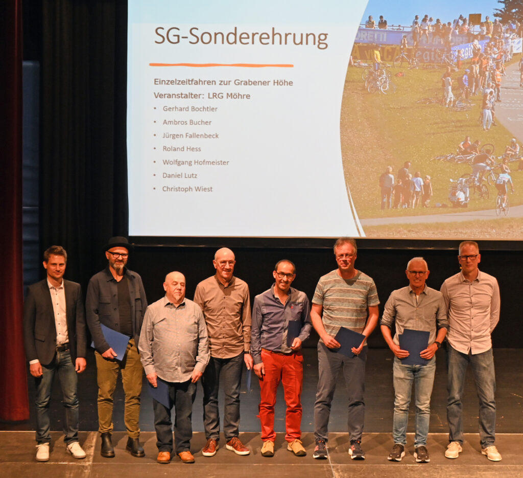 Mit Interviews und interessanten Informationen führte Benno Schultes durch die 2024er-Sportlergala. Auf die Bühne holte er die Meister-Sportler vom Ruderverein, der Vereinigten Schützen, die Läufer und Triathleten, darunter die Jüngste mit zehn Jahren und den Ältesten mit 90 Jahren, Tischtennisspieler und Volleyballerinnen. Einen Sonderpreis für ihre organisatorische Leistung seit vielen Jahren bekamen die Mitglieder der LRG Möhre für die Ausrichtung des Einzelzeitfahrens auf die Grabener Höhe.