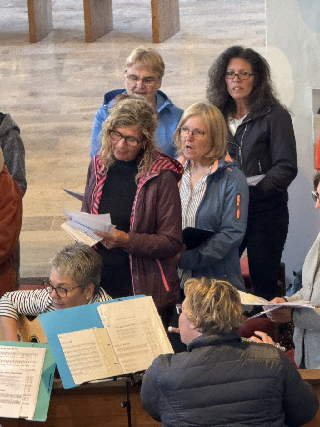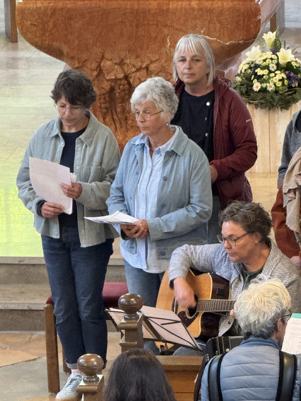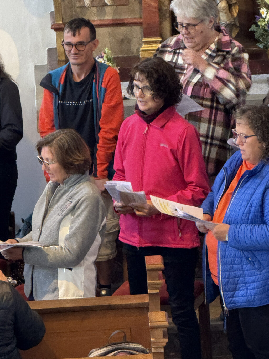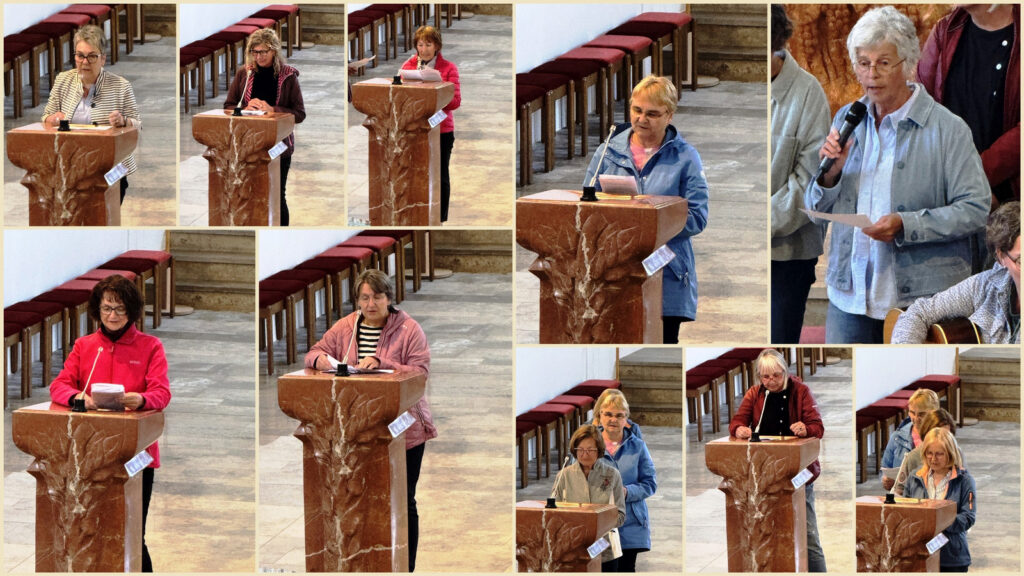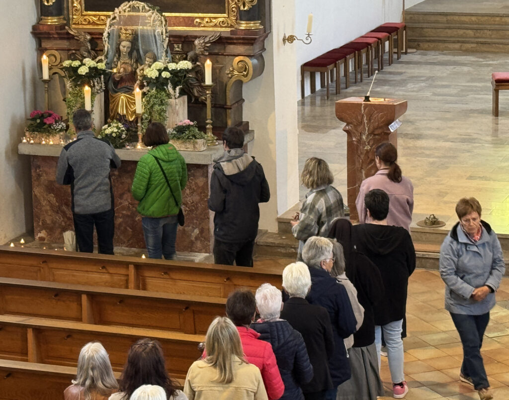 Nicht nur die Mitglieder des Singkreises machten sich gegen Ende der Maiandacht auf, um brennende Kerzen vor dem Maialtar abzustellen. Auch die Besucher der Andacht waren dazu eingeladen worden, ihre besonderen Bitten auf diese Weise zum Ausdruck zu bringen und Maria, unsere Königin des Friedens, um ihre Fürsprache in den persönlichen Anliegen zu bitten. Gaby Spieler vom Team des Singkreises erbat am Schluss den Segen Gottes für alle und wies auch darauf hin, dass die Andachtsvorbereitung des Singkreises sich auf den Tod von Papst Franziskus bezogen hatte und noch nicht auf den jetzt neu gewählten Papst Benedikt XVI.