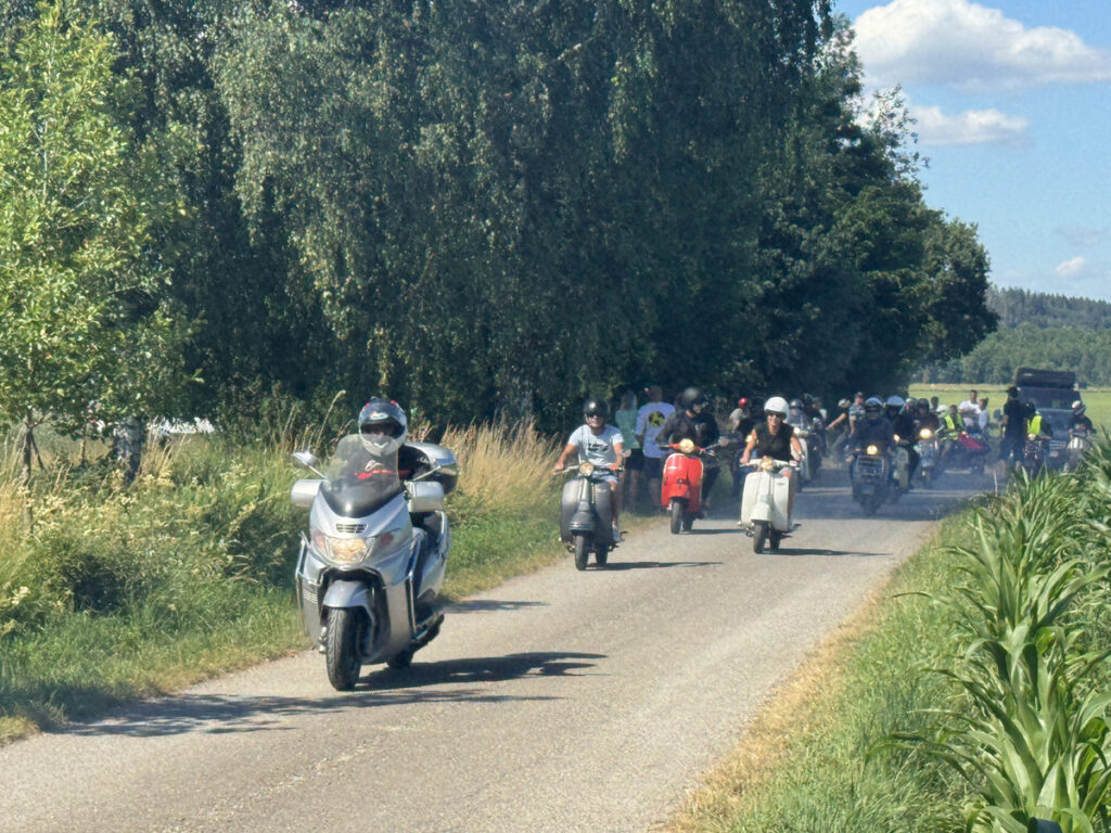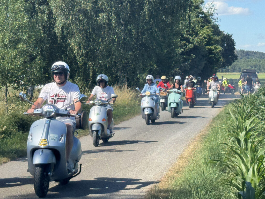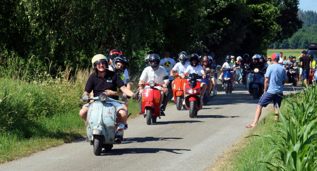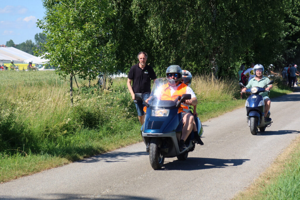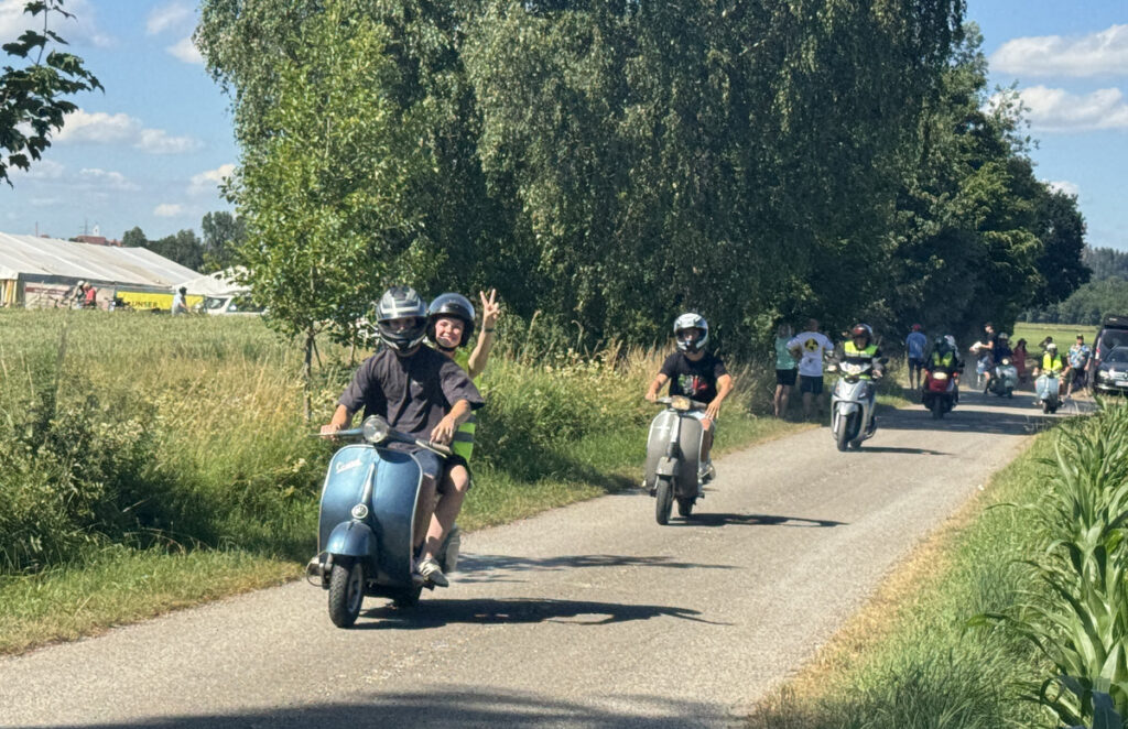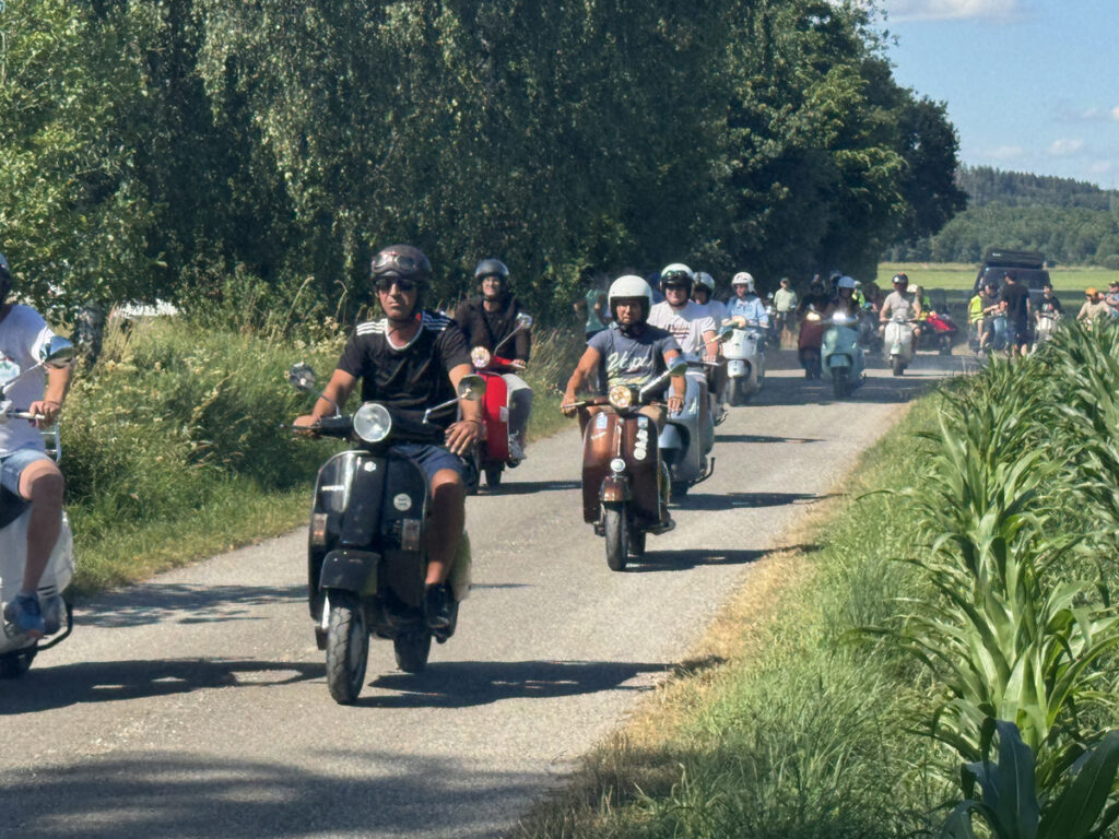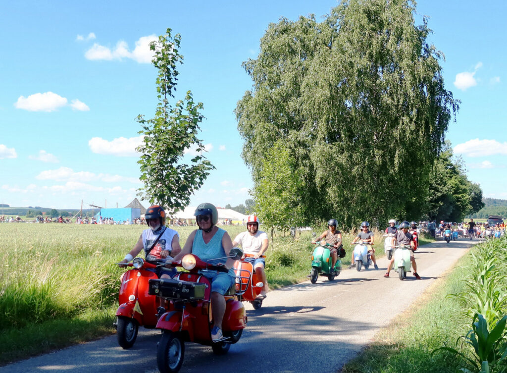 Am Corso nahmen dieses Mal wieder sage und schreibe 192 Rollerfreunde – Junge und Alte beiderlei Geschlechts – teil. Gestartet wurde in der Nähe des Festzelts bei der Brücke über die Osterhofer Ach. Die „Fahrt ins Blaue“ führte in die hügelige, prächtige Moränen- und Seenlandschaft des Vorallgäus in die Raumschaft um Bad Wurzach. Bewusst waren Nebenstrecken gewählt worden. Auf Vorgaben der Behörden durfte nur in kleinen Pulks nach festgelegtem Zeitabstand gestartet werden.