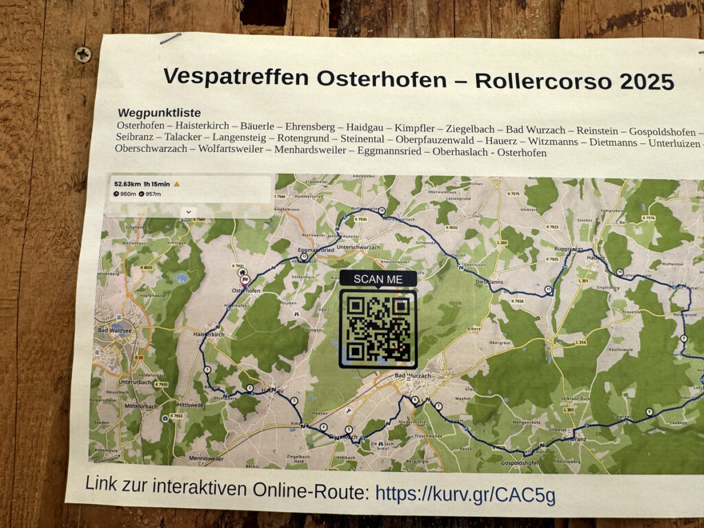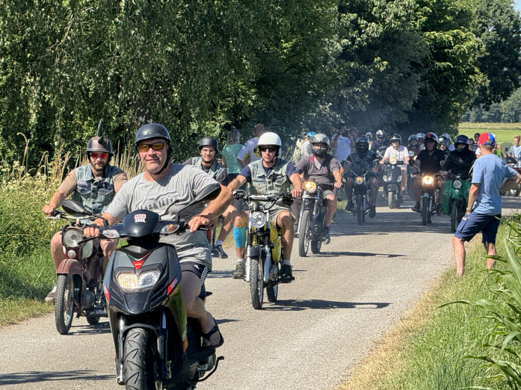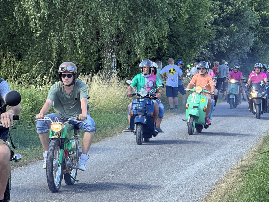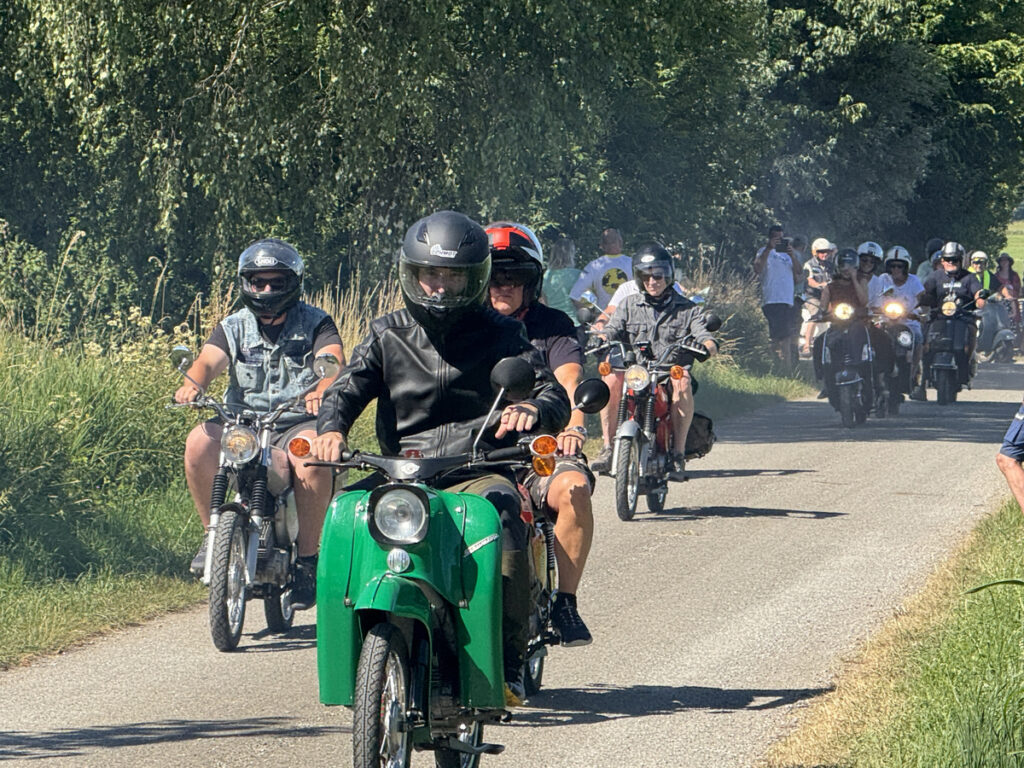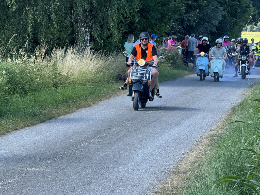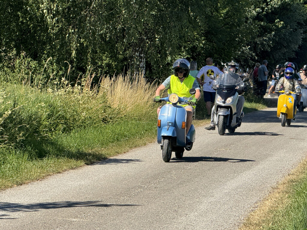 Am Corso nahmen dieses Mal wieder sage und schreibe 192 Rollerfreunde – Junge und Alte beiderlei Geschlechts – teil. Gestartet wurde in der Nähe des Festzelts bei der Brücke über die Osterhofer Ach. Die „Fahrt ins Blaue“ führte in die hügelige, prächtige Moränen- und Seenlandschaft des Vorallgäus in die Raumschaft um Bad Wurzach. Bewusst waren Nebenstrecken gewählt worden. Auf Vorgaben der Behörden durfte nur in kleinen Pulks nach festgelegtem Zeitabstand gestartet werden.