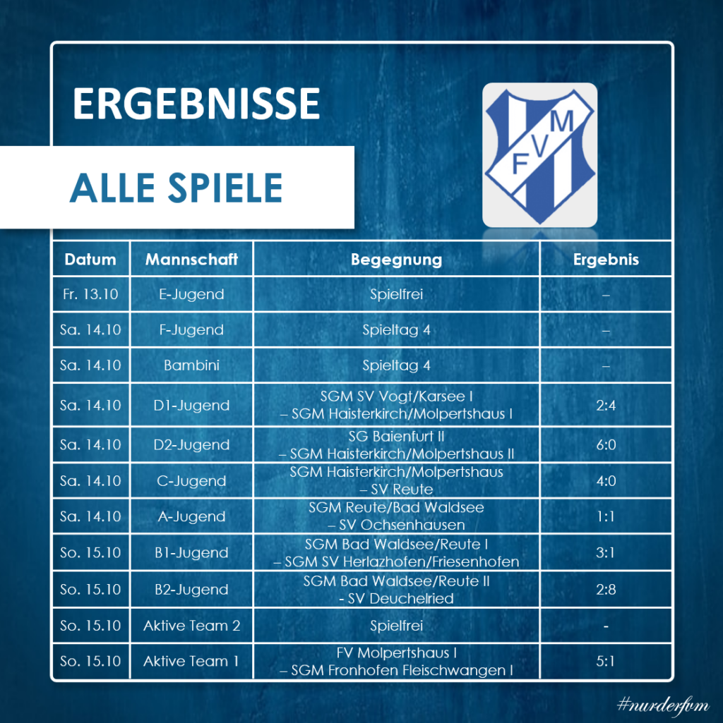 Nach der Pause kam die SGM besser ins Spiel, doch die Hintermannschaft des FV Molpertshaus hielt gut dagegen, sodass dem Gast kein Treffer mehr gelang. Stattdessen könnte D. Hafner für Führung noch auf 5:1 ausbauen. Der Sieg gegen den direkten Konkurrenten sichert jetzt wieder den Abschluss ans Mittelfeld, welcher am nächsten Sonntag gegen den TSV Berg II durch einen Punktgewinn gesichert werden soll.