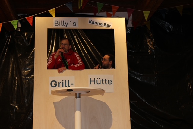 Bereits zum dritten Mal in Folge führten die beiden Moderatoren Alexander „Wiese“ Wiest und Michael „Mike“ Romer mit viel Witz und Charme durch das Programm. Sie traten erneut in verschiedenen Rollen und als dorfbekannte Charaktere auf, um auf humorvolle Weise über das Vereins- und Dorfgeschehen des vergangenen Jahres zu berichten. Ob Yoga, Photovoltaikanlagen, Feuerwehrhaus, die Ortschaftsratswahl, Glasfaser oder der Waldseer Krimi „Kurschatten“ – kaum ein Thema blieb an diesem Abend unbehandelt.