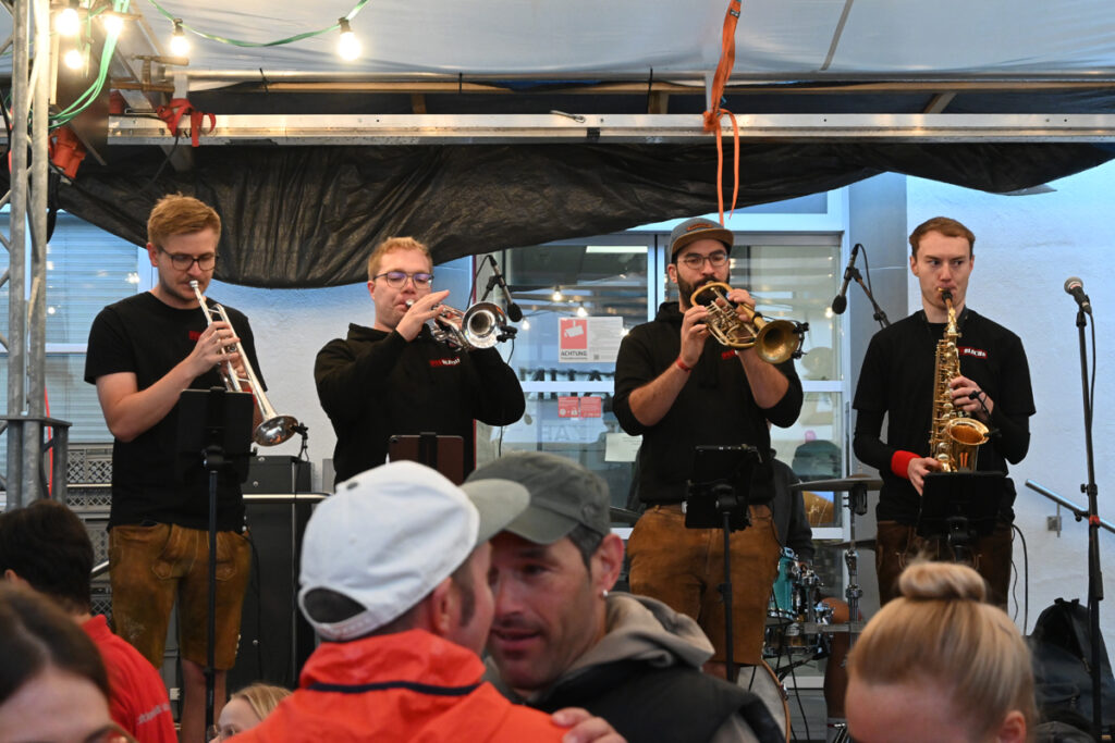 Als nächstes die Geburtstagskinder aus Bad Waldsee: Der Fanfarenzug in den neuen blau-schwarzen Uniformen. Fünfundfünfzig Jahre und kein bisschen leise. Auch die Waldseer brachten einen gelungenen Auftritt aufs „Parkett“.
