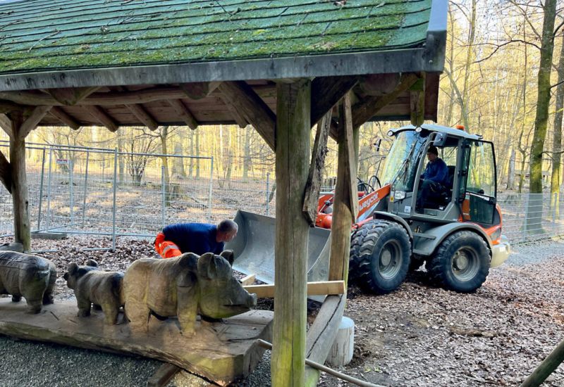 Die geschnitzten Wildschweine, ein echtes Highlight für Kinder, stehen nun wieder sicher unter ihrer Überdachung. Über die Jahre waren die Stützpfosten des Dachs angefault. Nun wurden die beschädigten Teile der Stützpfosten durch Balkenschuhe aus Edelstahl ersetzt, die auf neue, feste Betonfundamente gesetzt wurden. So bleibt die Skulptur sichtlich für viele Jahre gut zugänglich für die kleinen Besucher. Die detailreiche Skulptur fasziniert nicht nur Kinder, sondern auch Eltern, die ihre Sprösslinge gerne auf den Holzwildschweinen reiten sehen und das ein oder andere Erinnerungsfoto knipsen. Besonders beeindruckend ist die Entstehung des Kunstwerks: Die gesamte Rotte wurde aus einem einzigen Baumstamm mit der Motorsäge geschnitzt – ein echtes Unikat im Tannenbühl!