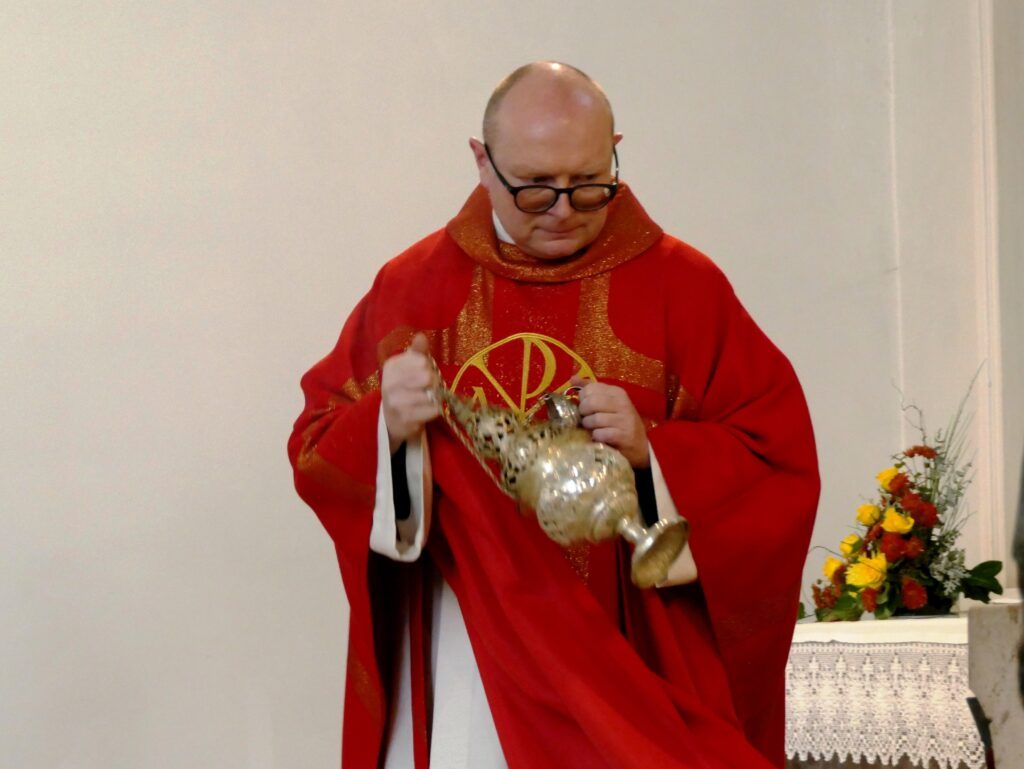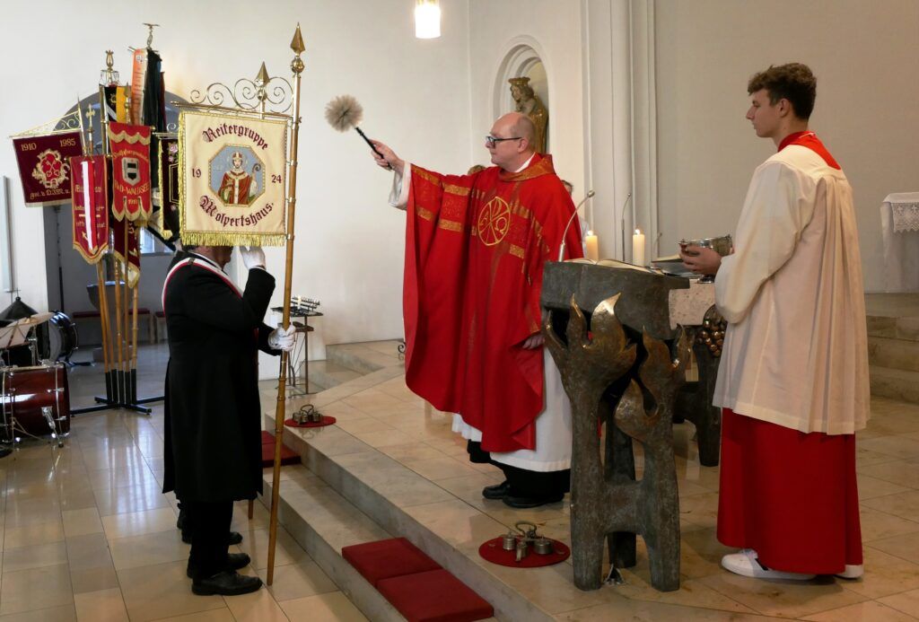 In seinen Worten bei der Standartensegnung (Bild) erinnerte der Zelebrant nach der Kommunion nochmals an die Patronin der Kirchengemeinde. So sprach er unter anderem die Bitte aus, dass sich „die Kameradinnen und Kameraden der Blutreiter in Molpertshaus in Frieden unter diesem Banner vereinen, die Generationen verbinden und der Jugend Möglichkeiten des Kontaktes und der Zuwendung bieten“. Die Standarten sollen alle, „die diesem Zeichen folgen, zu einer Gemeinschaft des Friedens, der Hilfsbereitschaft und des Gebetes zusammenschließen, Freude spenden und Mut geben“, so Pater Hubert wörtlich.