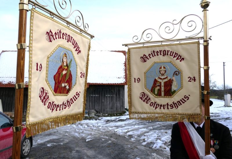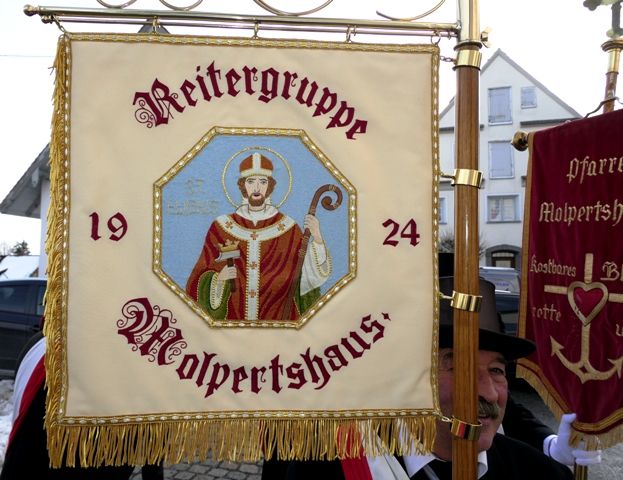 Im Hochamt anlässlich des Patroziniums konnte in der Pfarrkirche an ein erfreuliches Jubiläum mit einem würdigen Geschenk erinnert werden. Pater Hubert Vogel SDS segnete in einer feierlichen Zeremonie mit Weihrauch und Weihwasser die beiden ganz neuen Standarten der Blutreitergruppe mit gestickten Portraits der heiligen Katharina von Alexandrien und des heiligen Eligius von Noyon. Katharina wird in Molpertshaus als Kirchenpatronin verehrt, der nicht so bekannte Eligius von Noyon ist Patron der Mennisweiler Dorfkapelle und war Patron der im Jahre 1820 abgerissenen Loyenkapelle, die in Mennisweiler im Bereich der Kreuzung stand. Bis ins Jahr 1820 gab es in Mennisweiler im Gedenken an den heiligen Bischof Eligius, der einstmals Hufschmied war und einem störrischen Pferd, der Legende nach, ein Bein abnahm, um dieses zu beschlagen und danach wieder anzusetzen, einen nicht unbedeutende Prozession zu Pferde.
