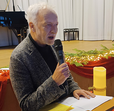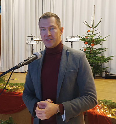 Pfarrer Thomas Bucher richtete das Wort an die Adventgäste und lud sie zum gemeinsamen Singen von “Oh Heiland reiß die Himmel auf ” ein.