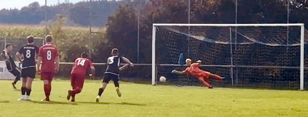 Nur wenige Augenblicke später bekommt der SVW einen Elfmeter wegen Handspiels zugesprochen. Wobei jetzt die Einheimischen auch laut protestierten, denn es handelte sich um ein äußerst zweifelhaftes Handspiel. Den Strafstoß verwandelte Lukas Lang zur erneuten Führung für die Gäste aus Wolfegg (Bild).