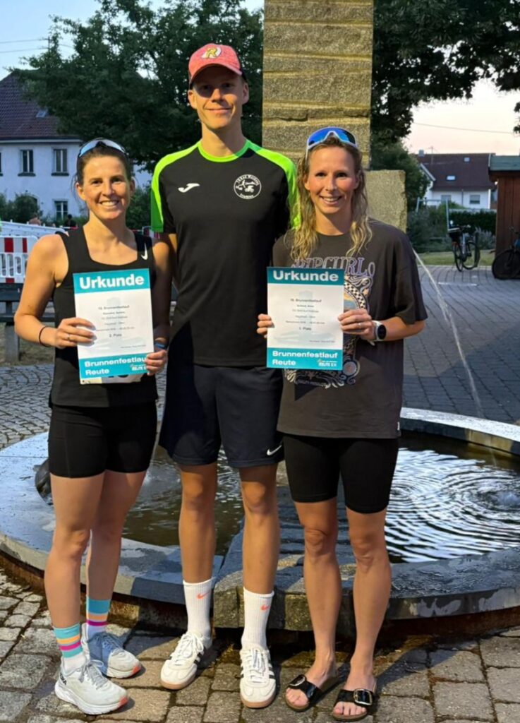 links Sandra Rauneker mit dem 2. Platz bei den Frauen W35, Moritz Speh mit dem 1. Platz bei den Männern und Anne Schmid mit dem 1. Platz bei den Frauen W30. Das sind Ergebnisse wie aus dem Märchenbuch.