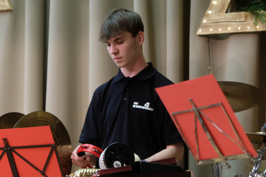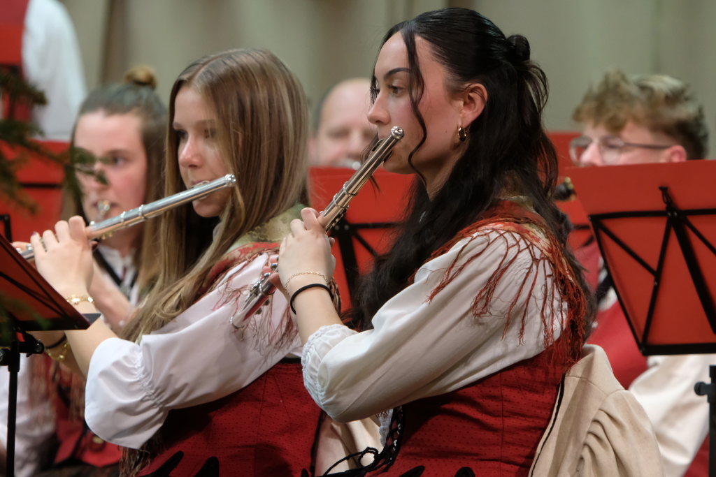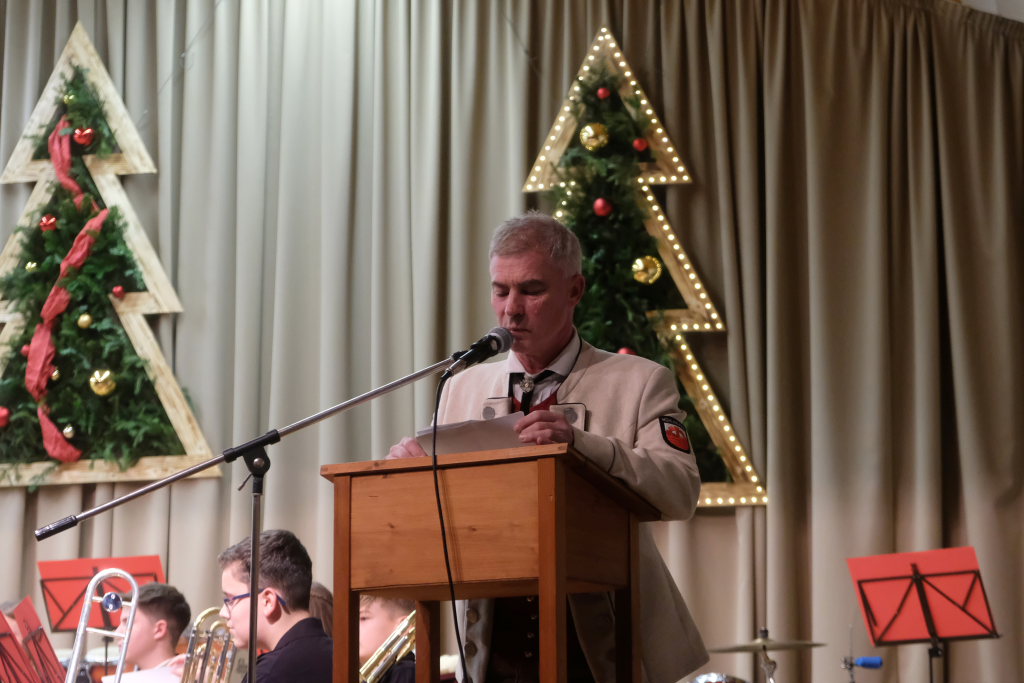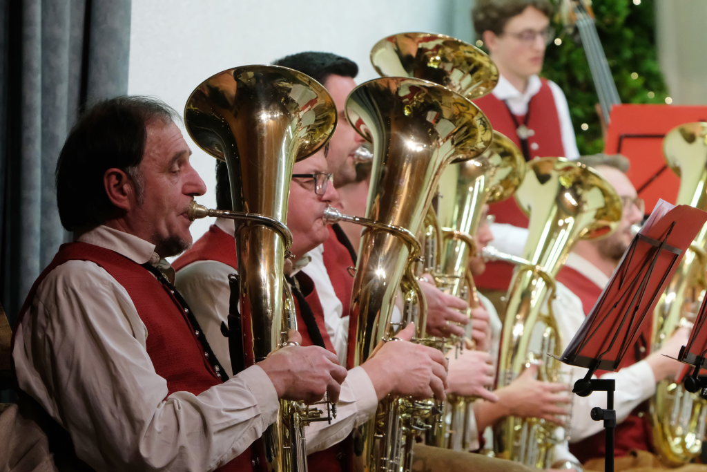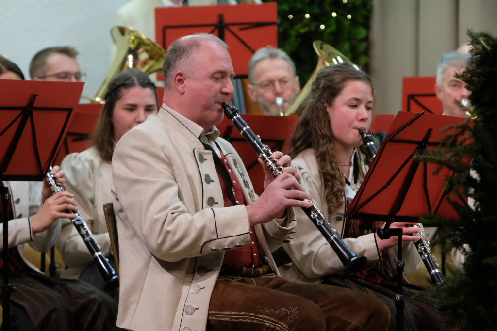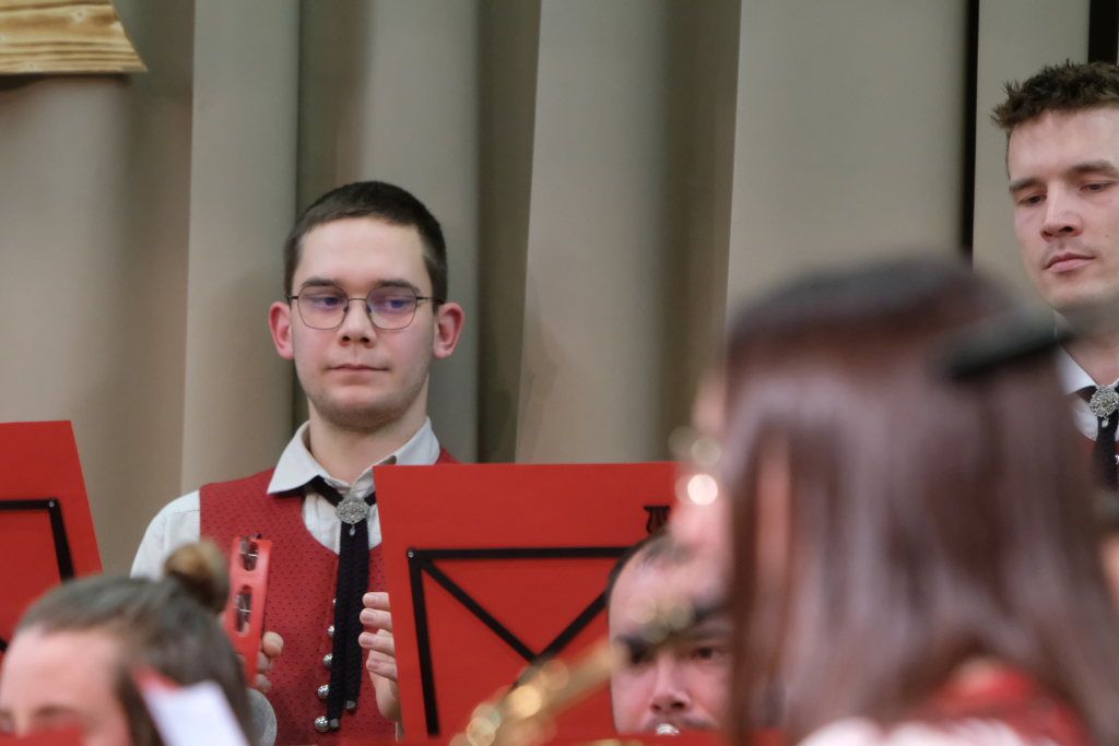 Zunächst eröffnete die Jugendkapelle Eberhardzell – Ellwangen – Füramoos – Mühlhausen den Konzertabend mit der „Fantasia di Natale“ von Luigi di Ghisallo alias Kees Vlak. Auf diesen vier traditionellen italienischen Liedern basiert die Komposition: „Canzone d’i Zampognari“, „Canto dei Pastori“, „Gesù Bambin L’e Nato“ und „Dormi, O Bel Bambin“ gemäß der Tradition, dass in Italien praktisch den ganzen Advent über viermal Weihnachten gefeiert wird. „Circle of Life“ wurde von Sir Elton John für den Zeichentrickfilm König der Löwen geschrieben. Das eher skurril anmutende Konzertstück „Bugs“ von David Shaffer besteht aus den vier Sätzen Leuchtkäferchen, Weberknecht, Schmetterling und Ameisen. Den Titel kann man also je nach persönlicher Einstellung zu den possierlichen Tierchen, die da kreuchen und fleuchen, als Ungeziefer oder Nützlinge interpretieren. Mit „Das Junge Weihnachtskonzert“ beendete die Jugendkapelle ihren Programmteil thematisch stimmig. Die Komposition von Alfred Bösendorfer ist ein speziell für Jugendorchester konzipiertes Medley aus den vier Weihnachtsliedern „Kling, Glöckchen“, „Ihr Kinderlein kommet“, „Fröhliche Weihnacht überall“ und „Morgen kommt der Weihnachtsmann“. Bei der Zusammenstellung war es dem Komponisten einerseits wichtig, vier besonders im deutschsprachigen Raum bekannte Weihnachtslieder zu verwenden. Andererseits wurden die Lieder vom Komponisten auch aufgrund ihres einheitlichen Grundtempos ausgewählt.