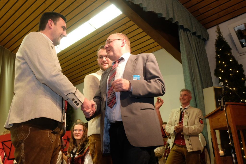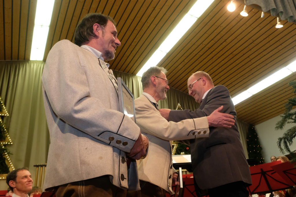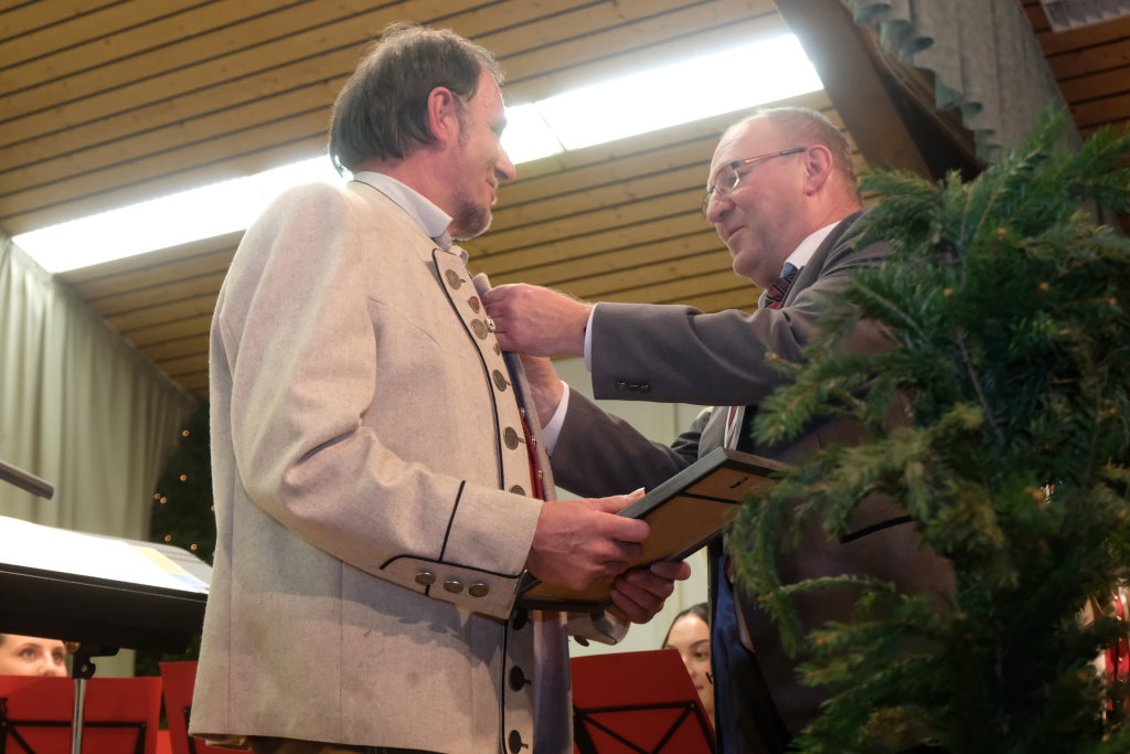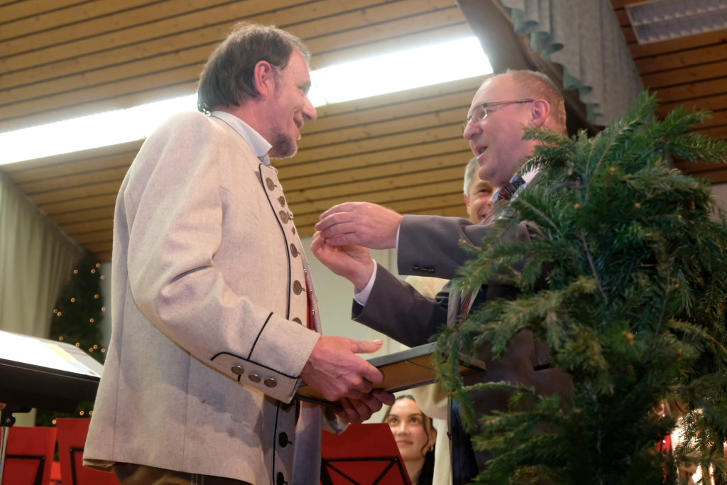 Walter Engeser als Vertreter des Blasmusikkreisverbandes hatte die Ehre, langjährige, verdiente Musiker zu ehren. Er tat dies mit dem ihm eigenen Humor. Der Erste, den er mit der Ehrennadel in Bronze des Blasmusikverbandes Baden-Württemberg für 10 Jahre aktive Tätigkeit auszeichnen durfte, war Fähndrich Robert Haller. Deswegen als Erster, weil er beim Konzert für den Getränkenachschub zuständig ist. Nicht dass es da zu Komplikationen kommen könnte…