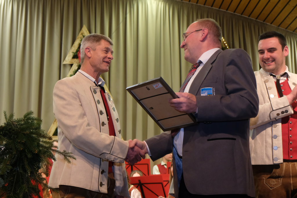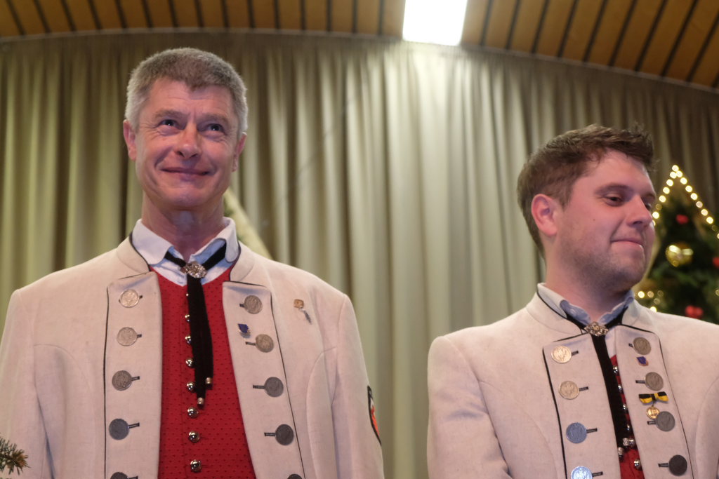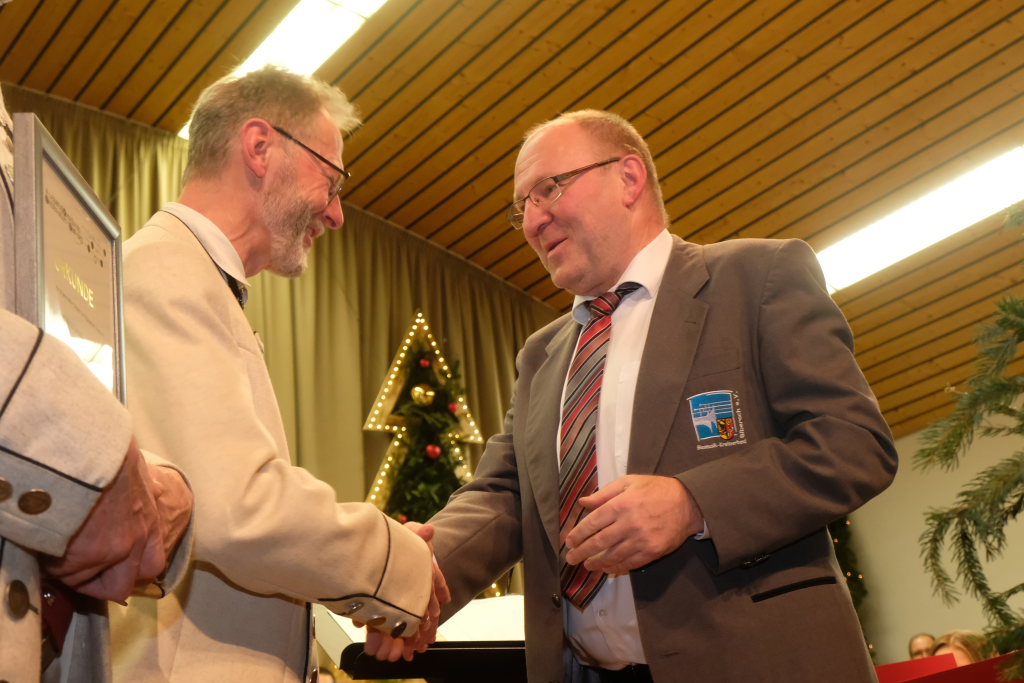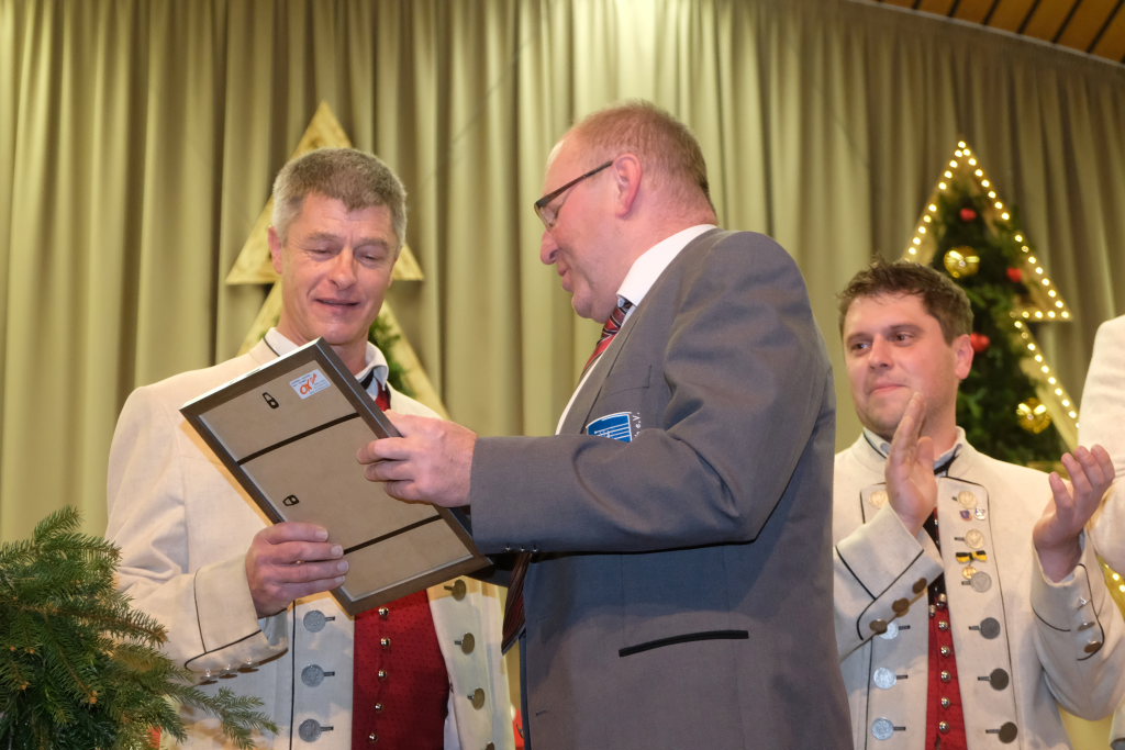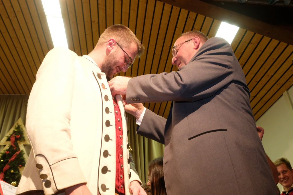 Walter Engeser als Vertreter des Blasmusikkreisverbandes hatte die Ehre, langjährige, verdiente Musiker zu ehren. Er tat dies mit dem ihm eigenen Humor. Der Erste, den er mit der Ehrennadel in Bronze des Blasmusikverbandes Baden-Württemberg für 10 Jahre aktive Tätigkeit auszeichnen durfte, war Fähndrich Robert Haller. Deswegen als Erster, weil er beim Konzert für den Getränkenachschub zuständig ist. Nicht dass es da zu Komplikationen kommen könnte…