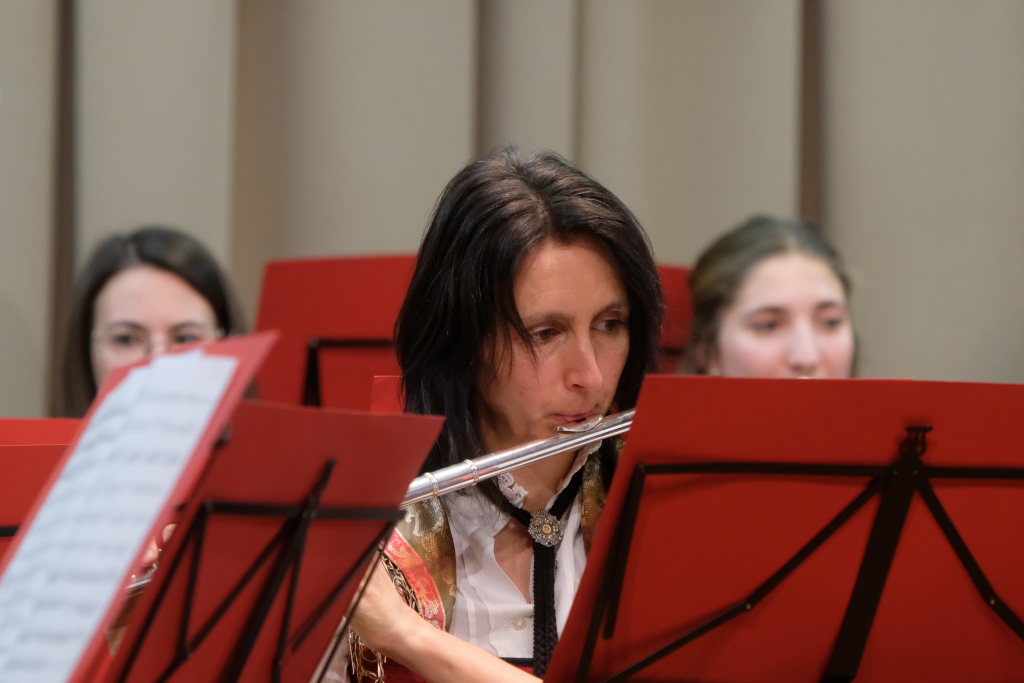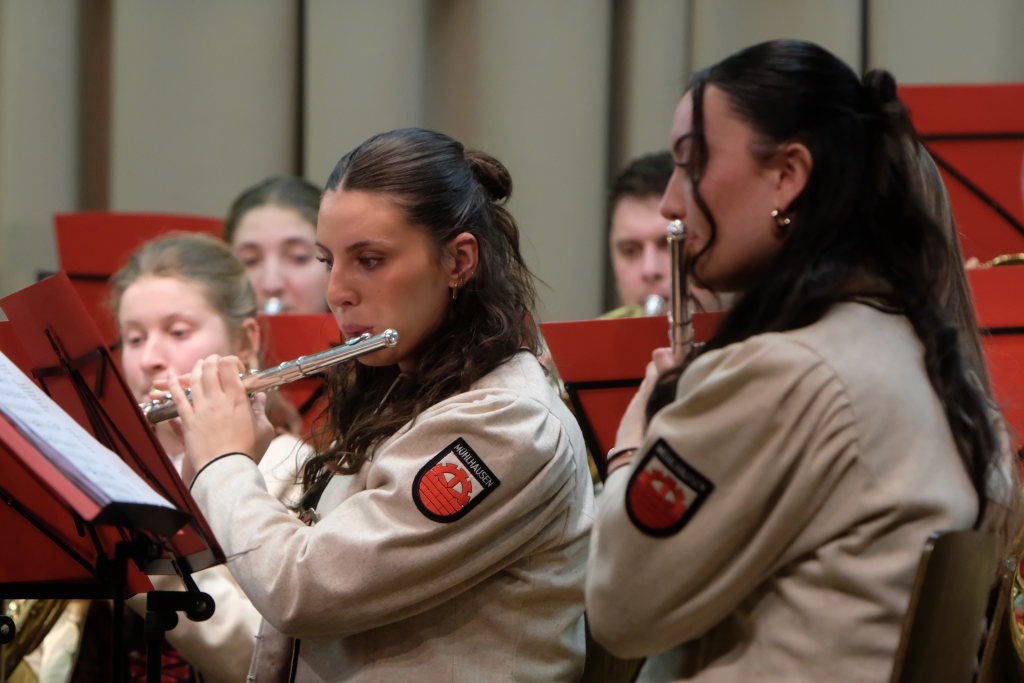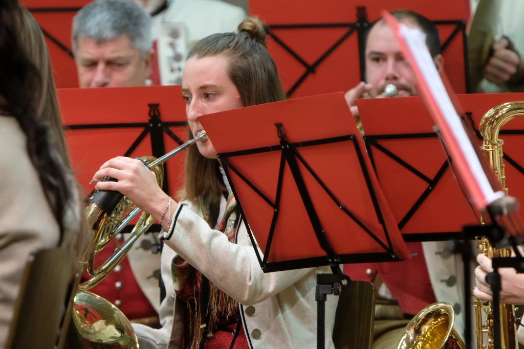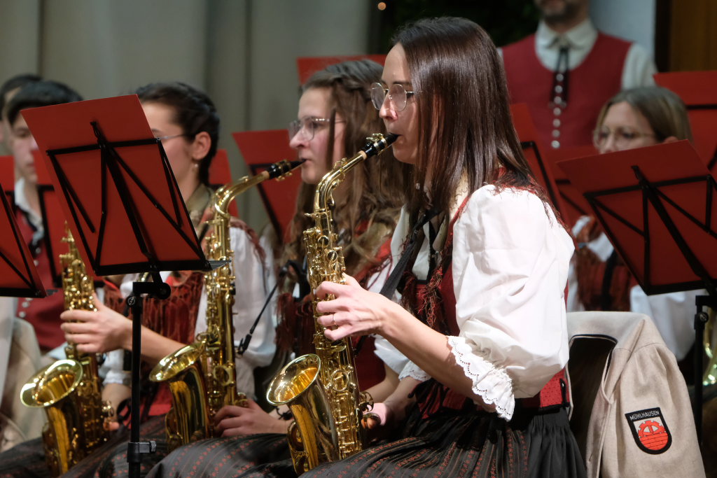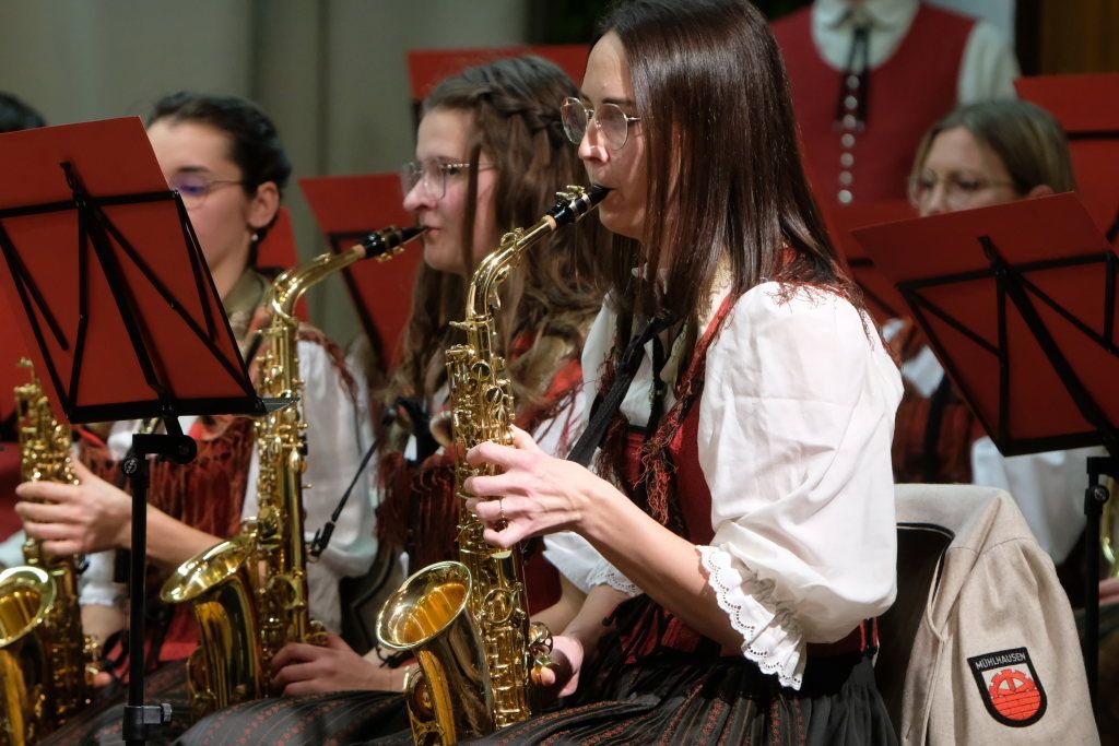 „Für diesen Musikstil ist es typisch, dass neben den üblichen Instrumenten einer Rockband mehrere Schlagzeuger mit verschiedenen Schlaginstrumenten spielen, die sich mit verschiedenen Rhythmen überlagern, wodurch ein einzigartiger Groove entsteht. Unser Orchester wird in diesem Stück quasi zu einer sehr großen Big-Band, bei der Sie rockige Klänge mit einem kontrastreichen Wechselspiel unserer vielfältigen Instrumentengruppen hören können,“ fasste die ebenso charmant wie fachkundig die einzelnen Stücke ansagende Laura Haller das Besondere an dem Stück zusammen. Mit dem nächsten Stück wechselte die Musikkapelle geografisch von Mittel- und Südamerika in die USA, blieb aber in den 1960er und 1970er Jahren. Das Medley des legendären Pop-Duos Simon & Garfunkel umfasst die Hits „Bridge over troubled water , Mrs. Robinson, Sound of silence und The Boxer“. Vor allem Sound of silence kam in den letzten Jahren durch mehrere Coverversionen wieder in die Charts. Auf jeden Fall war das gelungene Arrangement von Kurt Gäble mit seinem Wechsel zwischen sanften Pop-Klängen, Passagen im Jazz-Sound und rockigen Tönen ein typischer Fall von „entspannt genießen.“ Im Jahre 2017 schrieb Kurt Gäble diese abwechslungsreiche,wunderschöne Polka im Auftrag eines Bauunternehmens für die oberöstereichischen Stadt Perg. Der besondere Charakter der Polka sind die zahlreichen Tempowechsel. Mit der Sweet Bells Fantasy von Martin Scharnagl wollten die Mühlhausener Musiker sich eigentlich verabschieden. Diese ist eine kreative Fantasie über das deutsche Weihnachtslied „Süßer die Glocken nie klingen“, dessen typisches Motiv die Kapelle in immer neuen Instrumentierungen präsentierte.