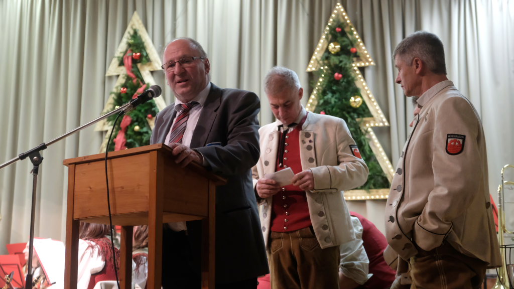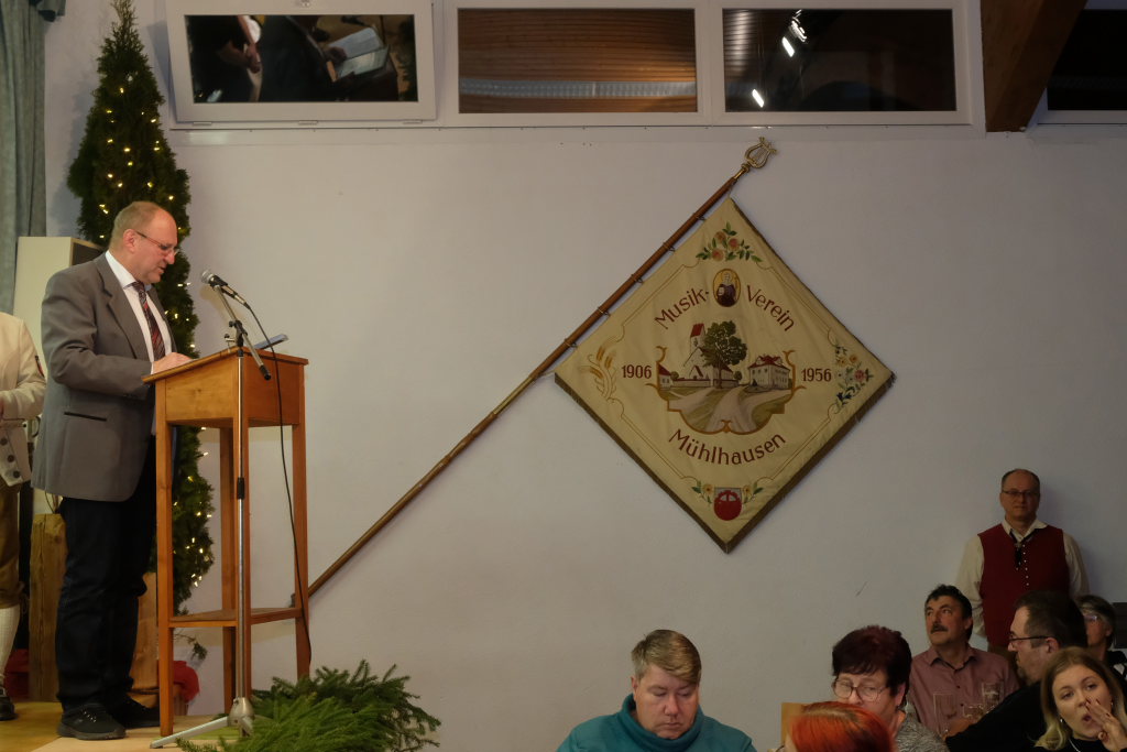 Vorstand Peter Branz freute sich in seiner Begrüßung, neben dem Eberhardzeller Bürgermeister Gunther Grabherr und dem Mühlhausener Ortsvorsteher Hubert Ego auch Walter Engeser vom Blasmusikkreisverband Biberach willkommen heißen zu können, der später die Ehrungen verdienter Musiker vornehmen sollte.