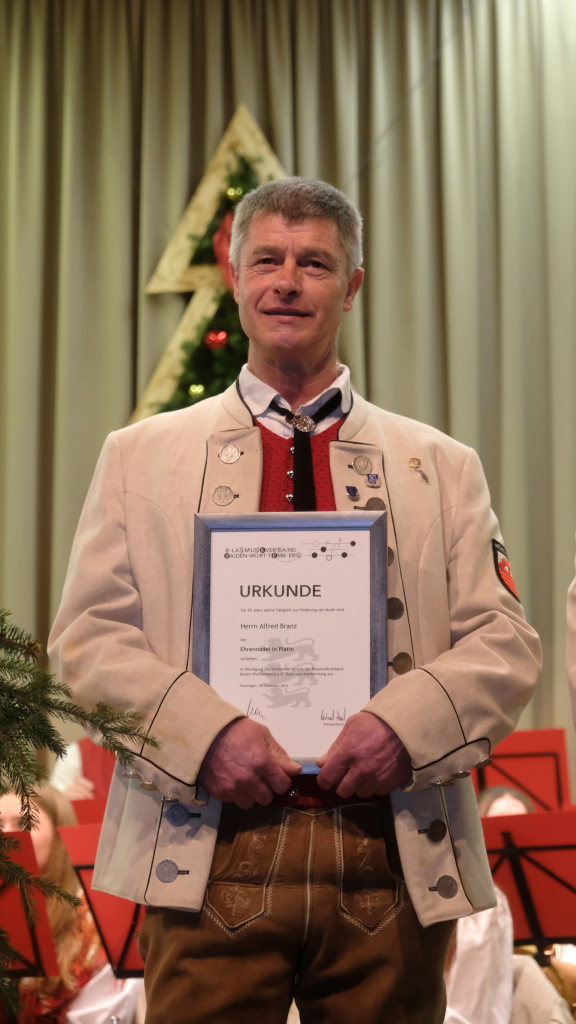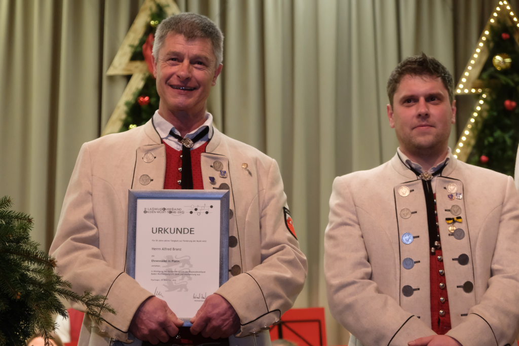 Alfred Branz kommt ebenfalls aus dem Trompeten-Register, allerdings begann er seine Ausbildung bereits vor 50 Jahren. Von 1983 bis 1995 war Alfred Branz im Ausschuss tätig. Er hat als Erster Trompeter ein wachsames Auge auf seine Registerkollegen und seine musikalische Begeisterung an seine beiden Kinder weitergegeben. Für 50 Jahre aktive Tätigkeit erhielt er die Ehrennadel in Platin mit Urkunde des BVBW.