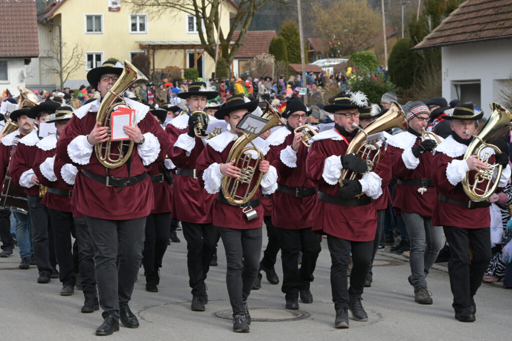Gleich am Kopf des Umzuges eine Fasnetsüberraschung. Nach Fahne und der Narrensamengarde kamen sechs ganz besonders hübsche Garde-„Mädels“: Sechs Zunfträte von Waldsee hatten sich in Gardekostüme von Farbe und Schnitt wie der Narrensamen, nur ein paar Nummern größer, gekleidet und paradierten gravitätisch mit. So konnte man endlich mal die schönen Beine des Fasnetsbüttels und seines Tambours sehen, die normalerweise in schweren Stiefeln stecken. Und die Federbaretts auf den Köpfen – sehr kleidsam. Da hatten sie die Lacher gleich auf ihrer Seite.