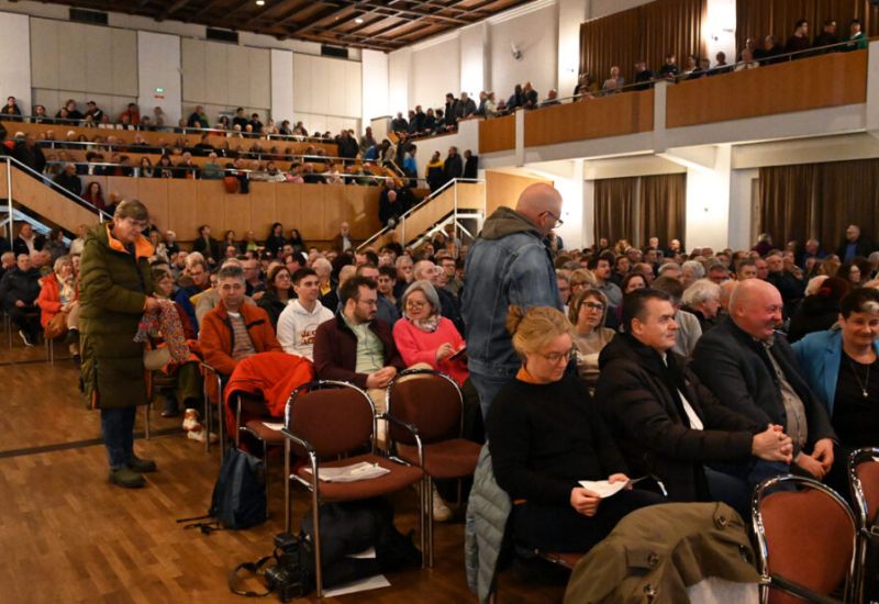 Die Stadthalle war rappelvoll. Nicht alle, die gekommen waren, konnten einen Sitzplatz ergattern und mussten sich deshalb mit Stehplätzen an den Eingangstüren zum Saal begnügen. Die Stimmung war von Anfang an gespannt und man hatte das Gefühl, dass die Besucher nicht positiv zur Windkraft eingestellt waren.