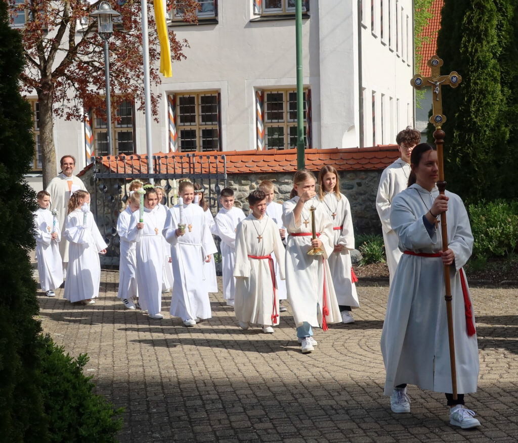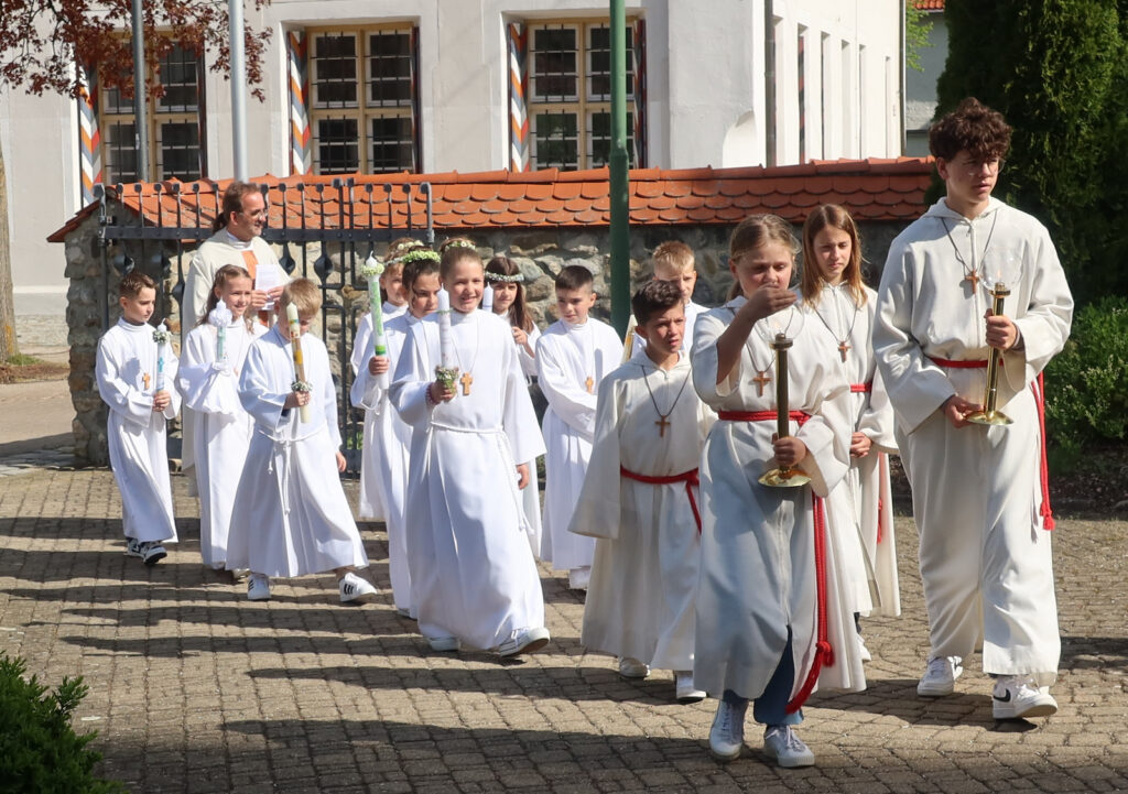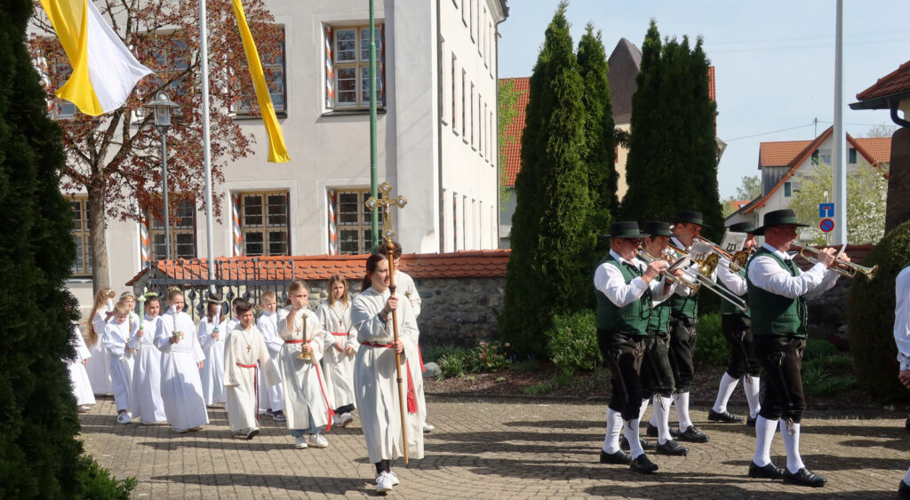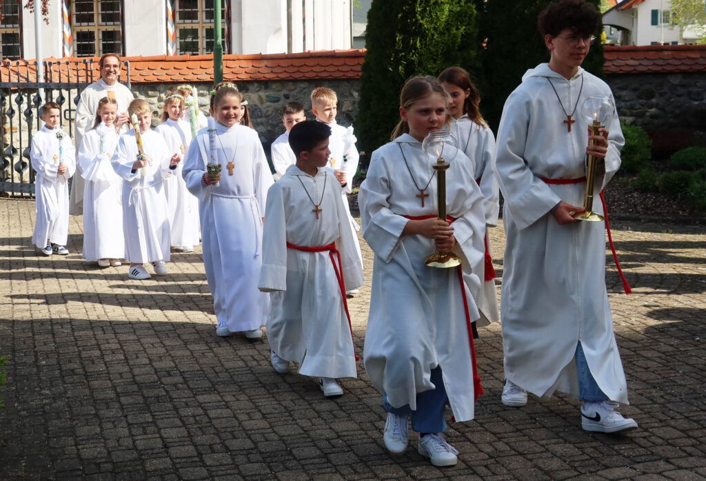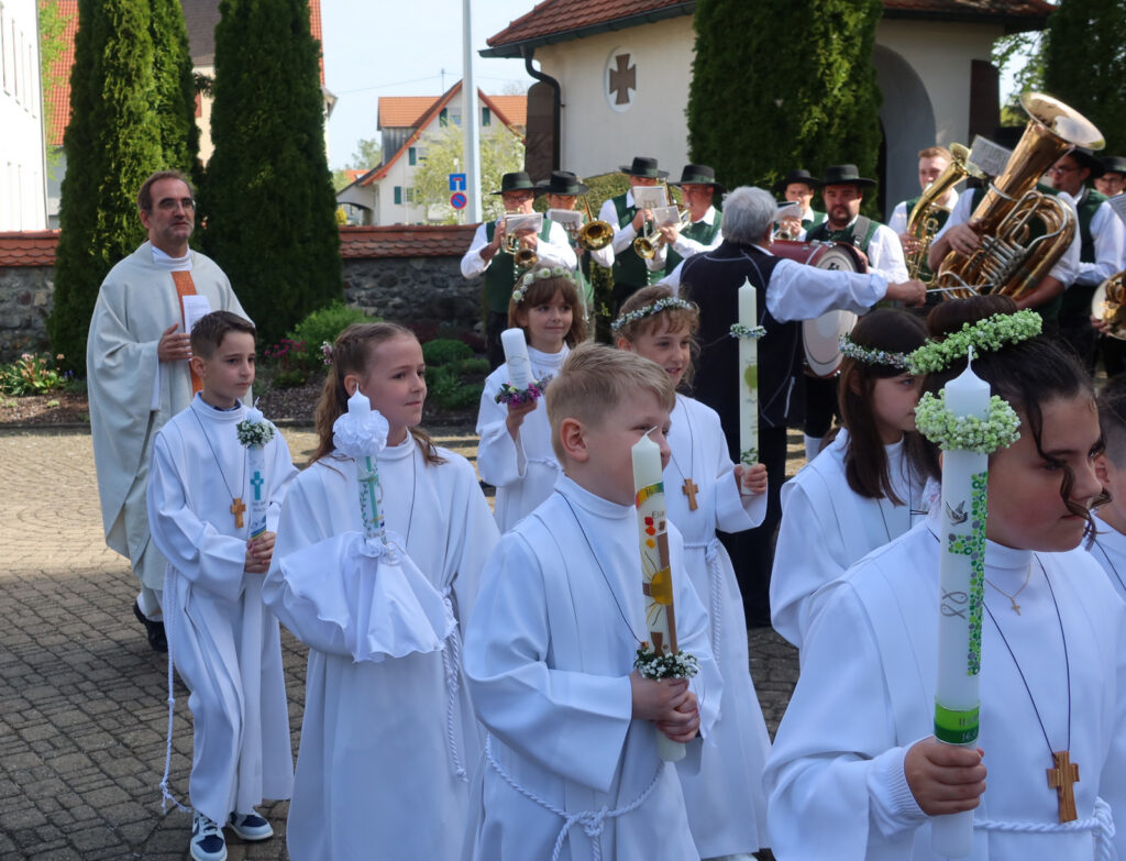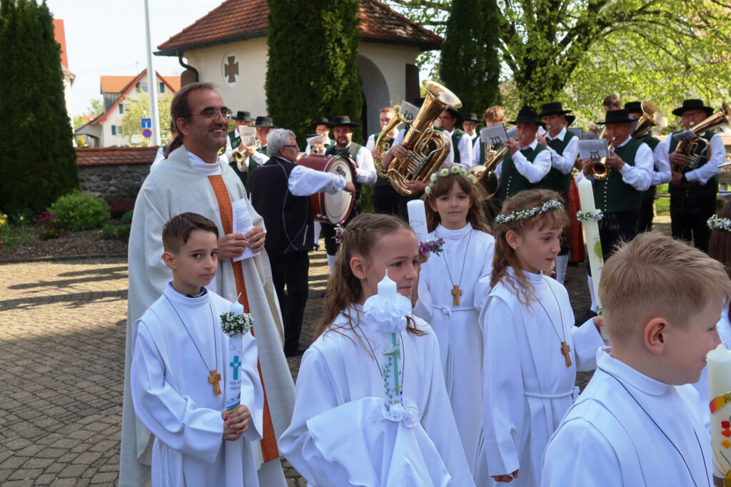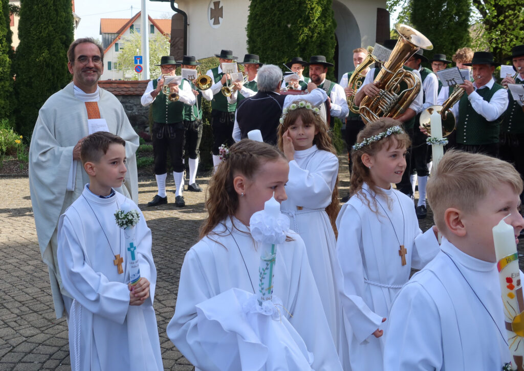 Bei frühsommerlichen Temperaturen und strahlendem Sonnenschein wurden die Kinder von Ministrantinnen und Ministranten und Pfarrer Stefan Werner im Klosterhof abgeholt und dann zu den Klängen der Musikkapelle Haisterkirch zum Gotteshaus geleitet.