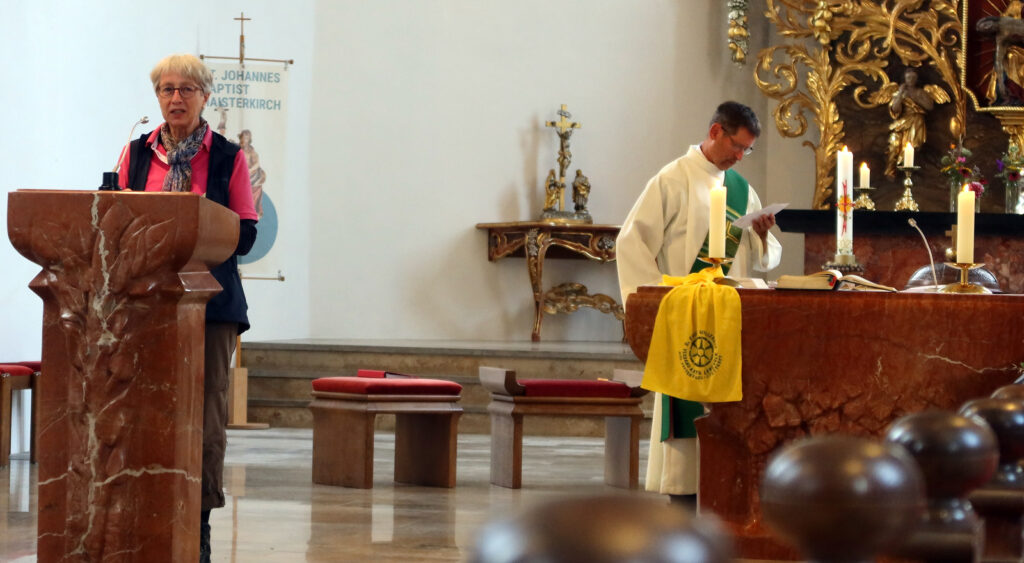 Die Gruppe besuchte auf ihrer Wanderung durch Oberschwaben am 5. August auch die Kapelle St. Sebastian und feierte unter Leitung von Diakon Wolfgang Bork, dem Kurseelsorger von Bad Mergentheim, in der Haisterkircher Pfarrkirche St. Johannes Baptist einen Gottesdienst. Dieser Gottesdienst wurde musikalisch, wie schon letztes Jahr, sehr feierlich und würdevoll umrahmt vom Sing- und Instrumentalkreis Haisterkirch. Gekommen zum Gottesdienst waren nicht nur die Pilgerinnen und Pilger mit ihren Fahnen-Abordnungen sondern auch Einheimische. Das Liedgut war sinnigerweise abgestimmt auf die Pilgergruppe mit passenden Liedtexten.
